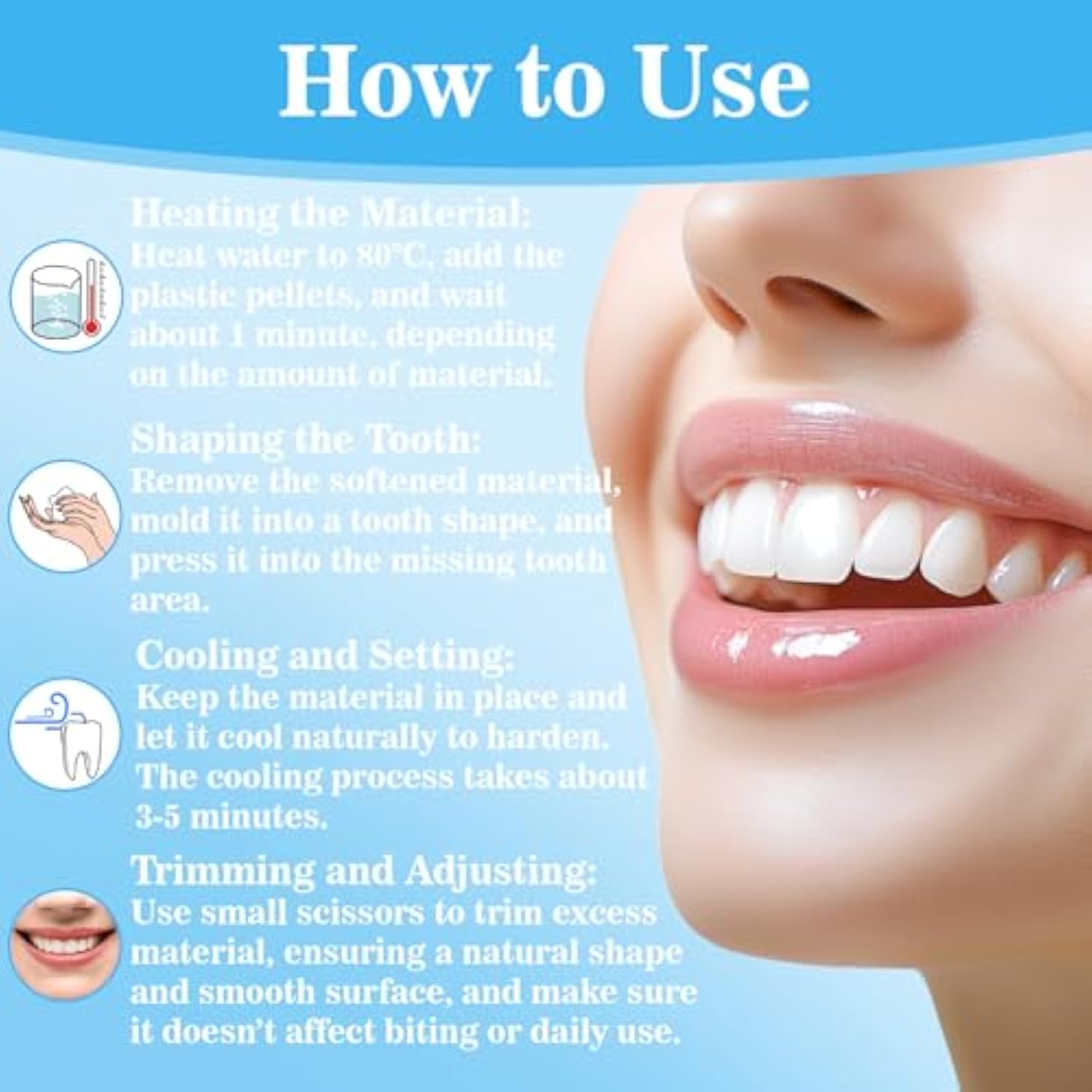 | Safe And Comfortable: Made From Flexible, Odorless Thermoplastic Beads That Fit Securely And Comfortably. Effectively Covers Missing, Discolored, Or Damaged Teeth For A Natural, Confident Smile At An Affordable Price | | Easy To Use: Simply Place The Repair Thermoplastic Beads In Hot Water At 70-80 Degrees. Stir To Mix, Then Shape Them To Fit The Missing Or Discolored Tooth. Once Cooled To Room Temperature, It Hardens And Can Be Applied To Improve The Appearance Of Damaged Or Darkened Teeth. Rinse With Cold Water To Speed Up The Process | | Wide Application: These Repair Whiten Fitting Beads For Fixing And Filling Missing Or Broken Teeth Help Cover Uneven, Stained, Or Chipped Teeth. Comfortable To Wear And Won’T Interfere With Eating Or Speaking | | Warm Reminder: Avoid Drinking Hot Beverages While Wearing The Tooth Solid Glue. Keep This Product Out Of Reach Of Children, As It Contains Small, Inedible Parts | | Meet Your Needs: The Thermoplastic Beads Offers Endless Possibilities For Various Applications. | |