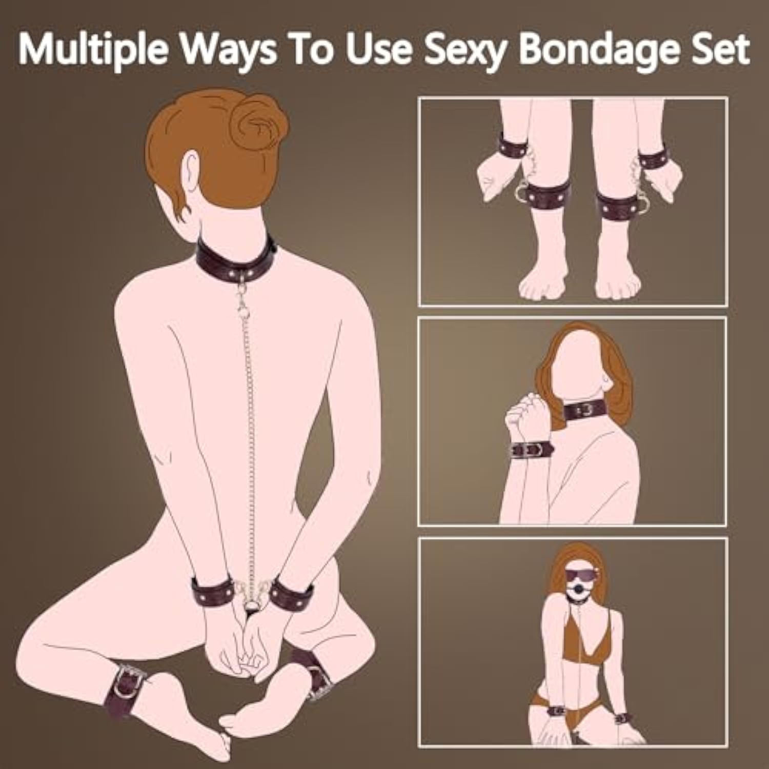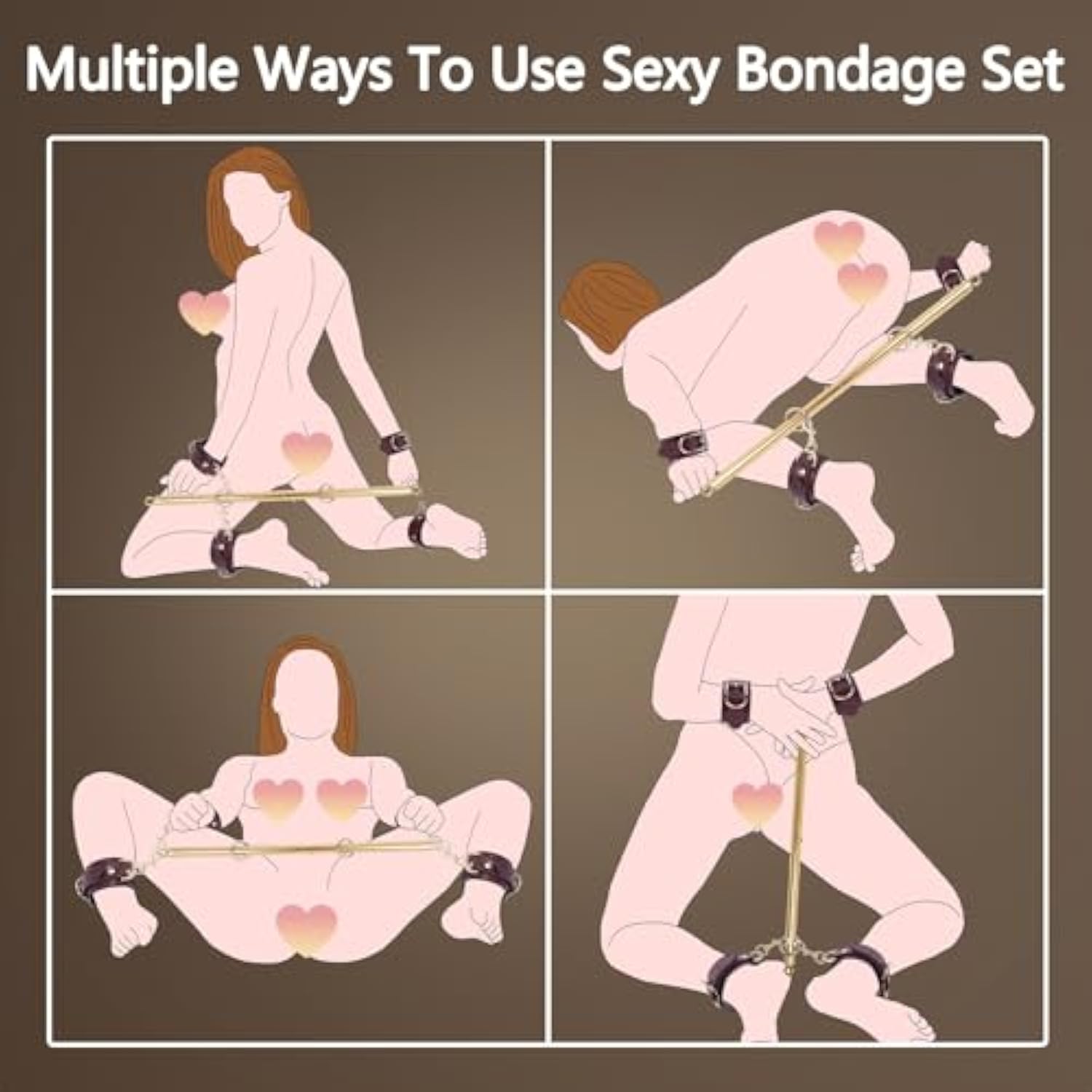 | Bondage Gear Accessories For Big Time Naughty: 1 × Matal Sex Bar, 2 × Wrist Cuffs, 2 × Shackles/Leg Restraints, 1 × Whip, 1 × Silicone Ball Gag, 1 × Collar, 1 × Leash, 1 × Blindfold. One Bondage Kit To Satisfy All Beginner/Experienced Bdsm Restraints Toy Fantasies. Sex Restraints Are Adjustable, So It Can Fit Almost All People Size | | Quality Comfort Heavy-Duty : Dual-Layer And Edge-Paint Leather That Is Soft And Gentle On Your Skin, Yet Sturdy Enough Even For Rough Play. Absolutely No Smell. Longer Service Life Than Ordinary Pu, More Suitable As A Gift | | More Ways To Sex Games: Spread Their Arms And Legs Open As Wide As You Want With This Sex Bondage Bar And 4 Cuffs. Enjoy Restraining, Spanking, Pleasuring And Teasing Your Lover As They'Re Bound, Tied Up, Blindfolded And Gagged! With This Complete Bdsm Restraint Device, You Can Try Lots Of Sex Positions | | Newest Adult Restraints: This Luxurious Bondaged Set Blongs To Mistress/Master. No More Boring Black, The Shiny Red Golden Sex Toy Set Adds Some Visual Feast To Your Cosplay. Top-Notch Ball Gag, Elastic Blindfold And Strict Dense Flogger Make Sex Things More Fun | | Easy To Use: Just One Click To Install The Bdsm Bar Like A Breeze. The Sex Spreader Bar Has 4 Holes, 2 End Rings And Comes With 2 O-Ring Connectors To Allow For A Variety Of Sexy Positions. It Is Lightweight And Can Easily Level Up Your Restraint Play | | Discreet Package Satisfactory After Service: The Packaging Box Will Not Display Any Information About The Couple Bedroom Intimacy Toys. If You Have Any Issue, Please Let Us Know | |