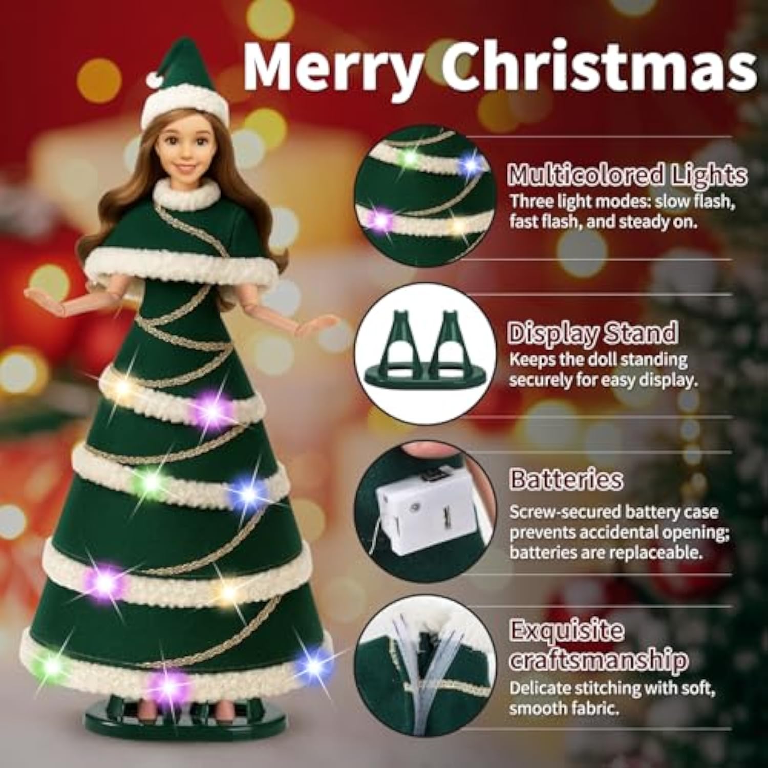 | ??? Unique Christmas Tree Design?This Doll Is Inspired By A Christmas Tree Design, Featuring A Layered Green Skirt, Golden Ribbon Accents, And A Santa Hat. It'S Adorable And Festive, Bringing A Strong Holiday Atmosphere. | | ? ? Colorful Led Light Effects?The Dress Features Built-In Multicolor Led Lights With Three Lighting Modes: Slow Flash, Fast Flash, And Steady On. It Makes The Doll Sparkle During The Holiday Season, Creating A Magical, Fairy-Tale Effect. | | ???Equipped With A Sturdy Display Stand?The Set Includes A Durable And Stable Doll Display Stand, Allowing The Doll To Stand Upright On Nightstands, Desks, Computer Tables, Or Other Surfaces. It Can Be Used As Holiday Décor Or For Safe Storage When Not In Use. | | ??? Perfect Holiday Gift For Girls ?A Fun And Creative Gift For Girls Aged 6–12. Ideal For Christmas, Birthdays, Or Doll-Themed Parties, This Light-Up Dress Adds Excitement And Joy To Playtime. | | ? ?? Easy To Use Safe?The Battery Compartment Is Secured With A Screw For Added Safety. Comes With 3 Replaceable Button Batteries. Long-Lasting Lights Bring Sparkle To Every Holiday Moment. | |