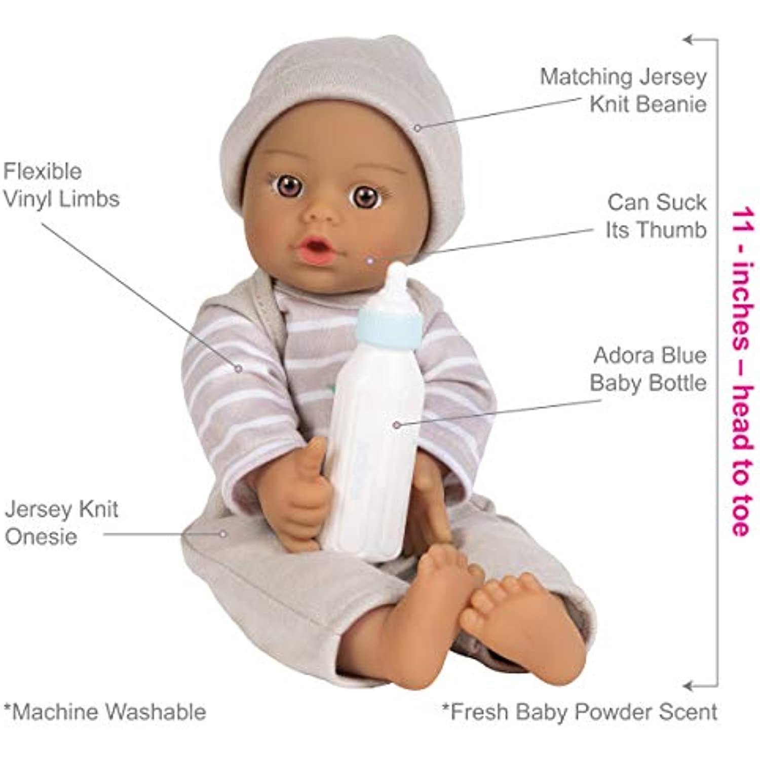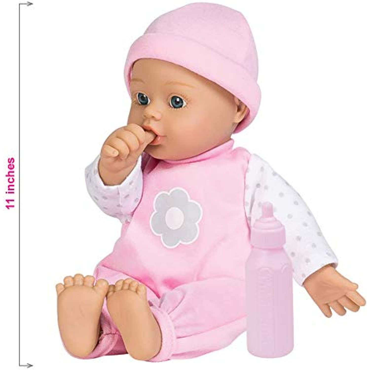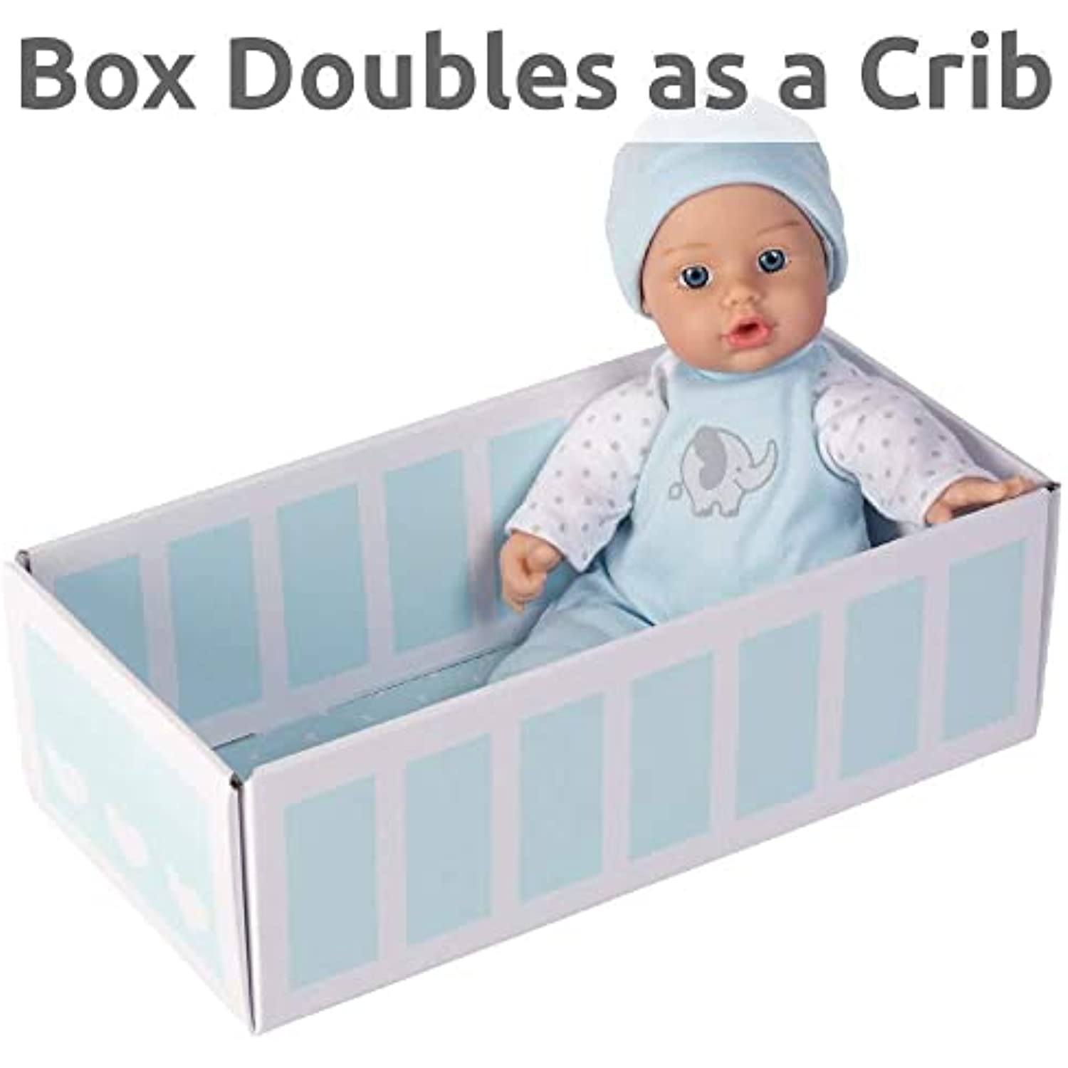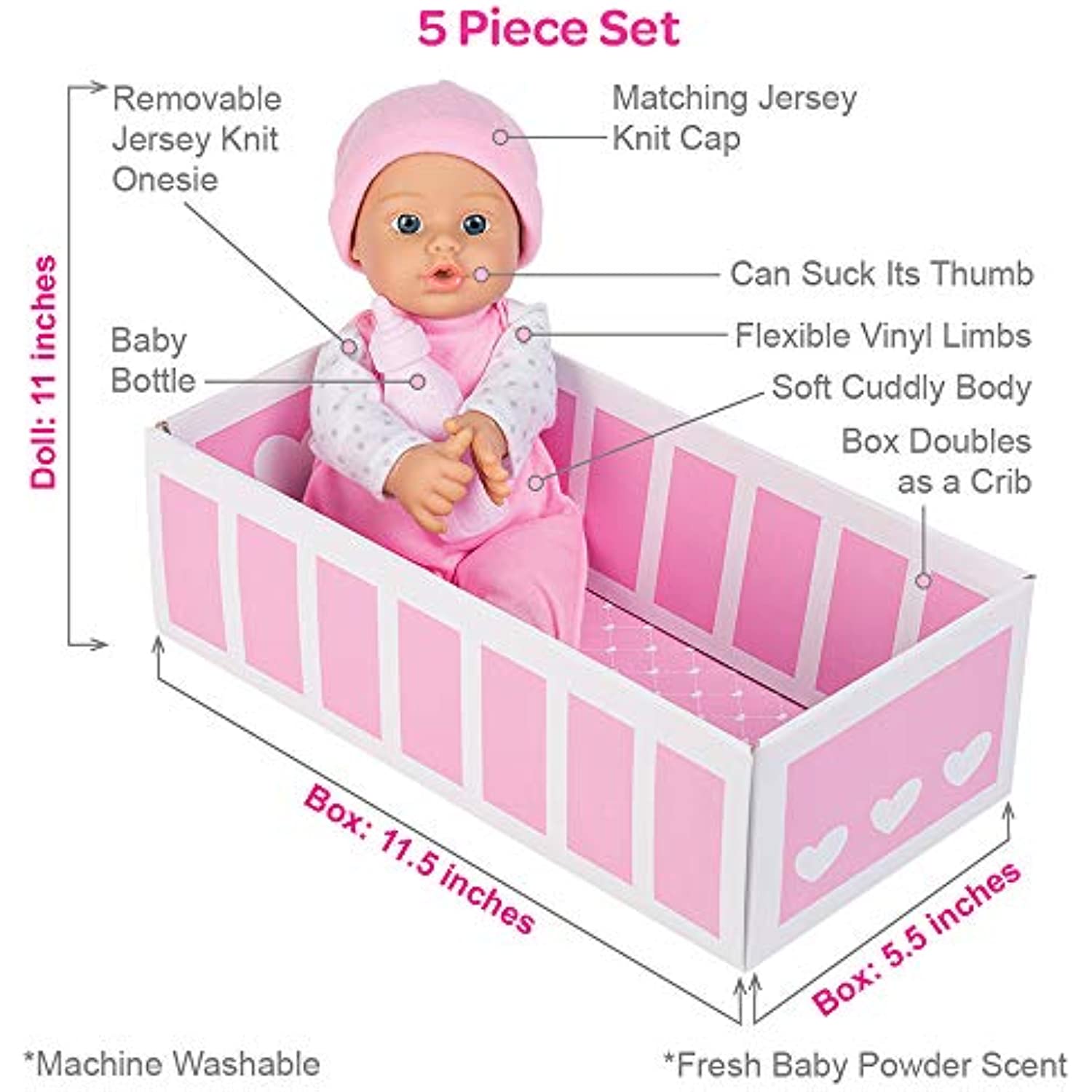 - This mini baby doll can suck its thumb and comes with a reusable crib box. Perfect toy for 1+ year old girls. Great gift for birthdays and holiday.