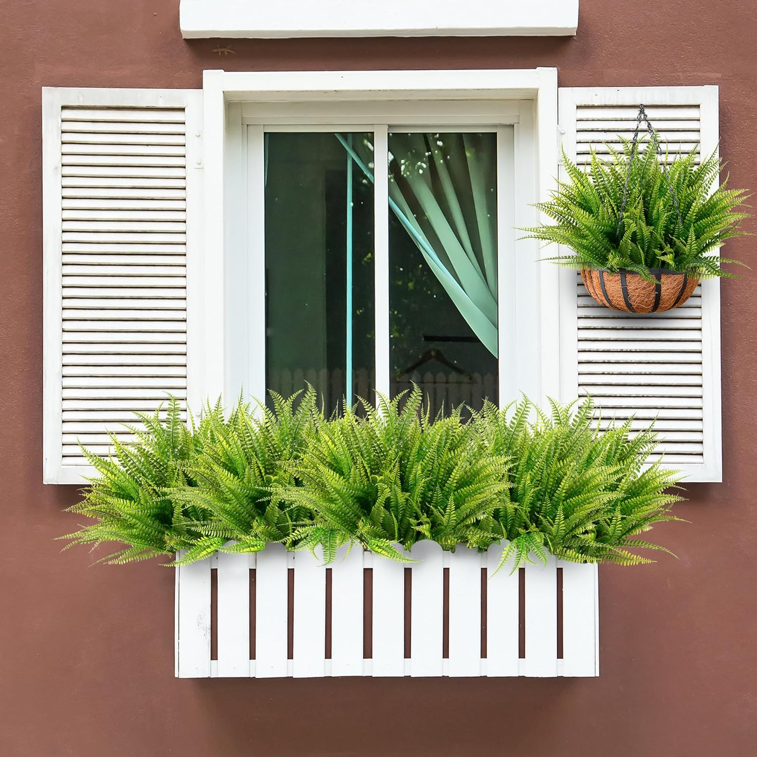 - [SIZE & PACKAGE]: The 12 bundles fake boston ferns bushes have a total length of 16.8 inch. Please expand and adjust the stem into original shape after receiving. Each leave can be disassembled or assembled at will. It’s normal if leaves fall off, just install it to original place.