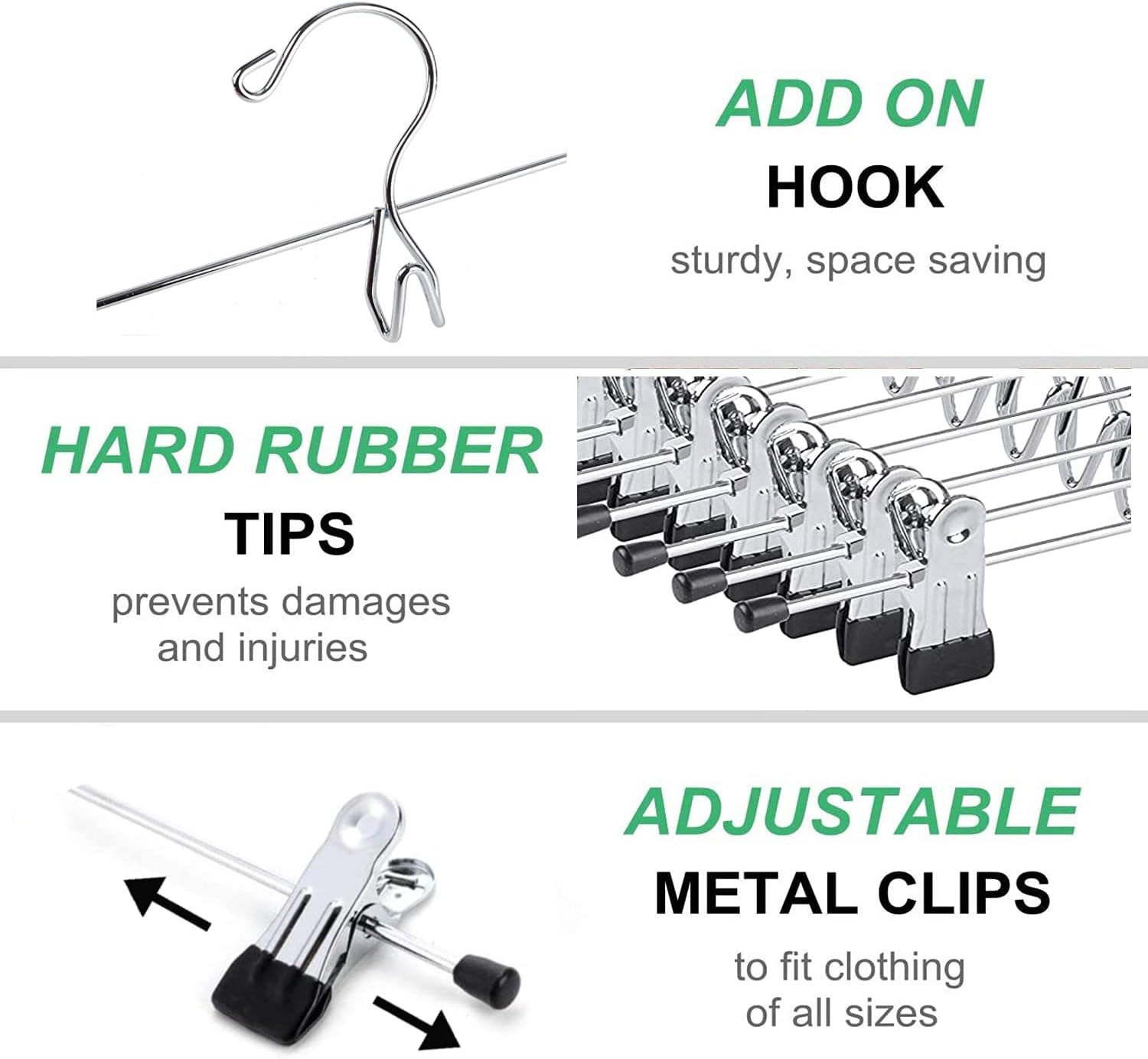 - ăAdjustable ClipăPowerful metal clips can be adjustable easily to adjust the width to fit different size of your trousers. Small caps on the ends of hanger prevent snagging or tearing your clothes.