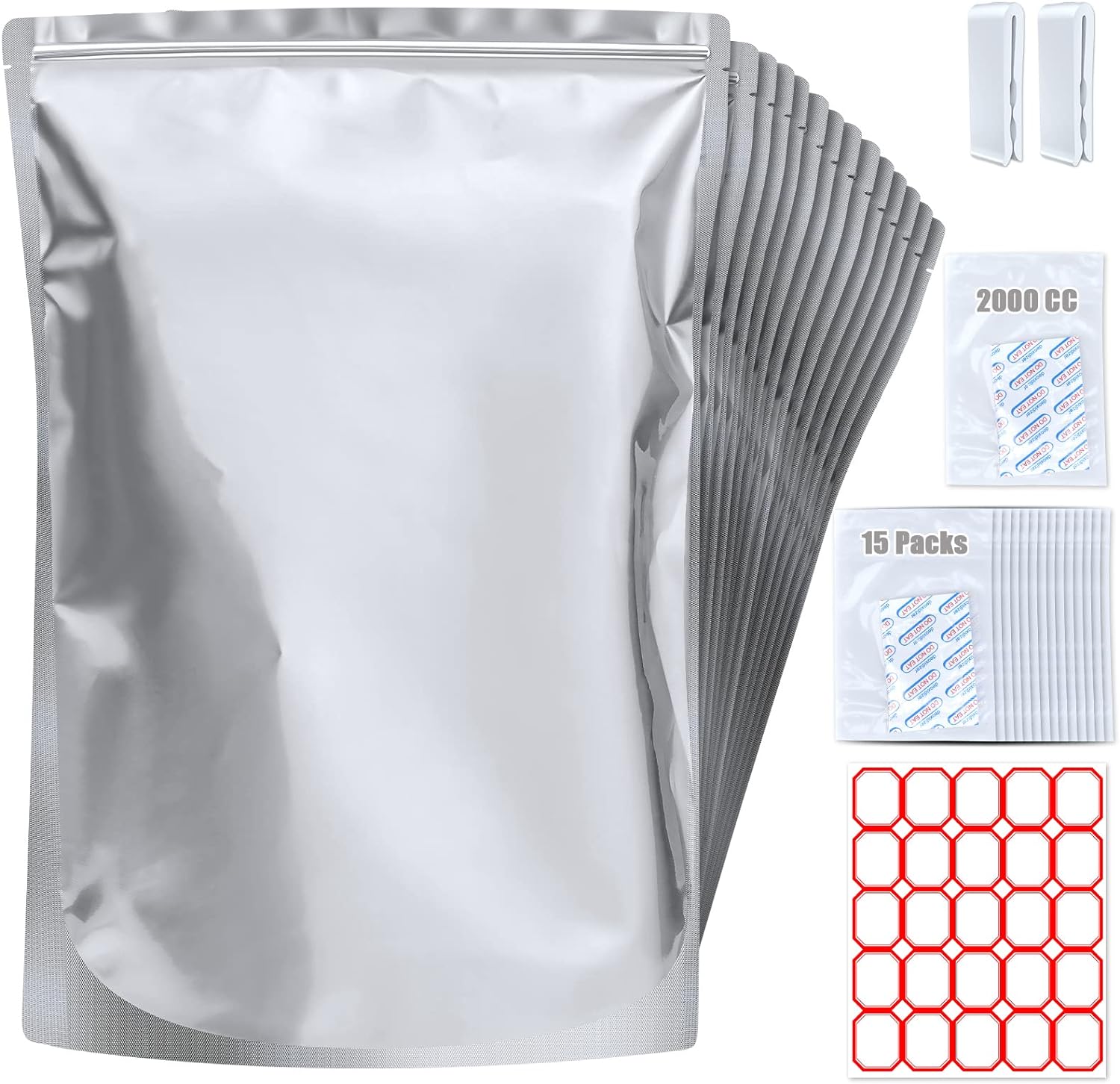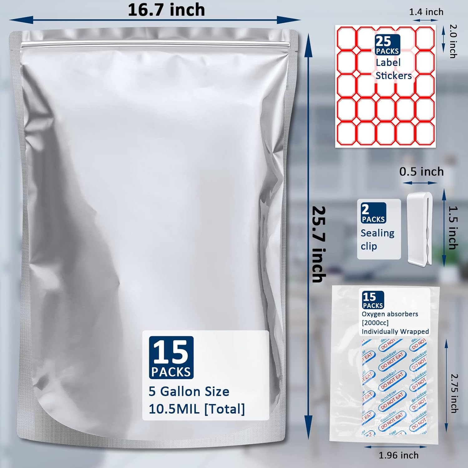 - [4 IN 1 MYLAR BAGS SET] You get extra large capacity, 10.5mil thick, heat-sealable, stand-up 15 pack 5 gallon mylar bags, 15 individual 2000cc oxygen absorber packets, 25 sticker labels for food storage(1.4” x 2”) and 2 sealing clip for sealing the mouth of the bag, it easily meet your food storage needs.