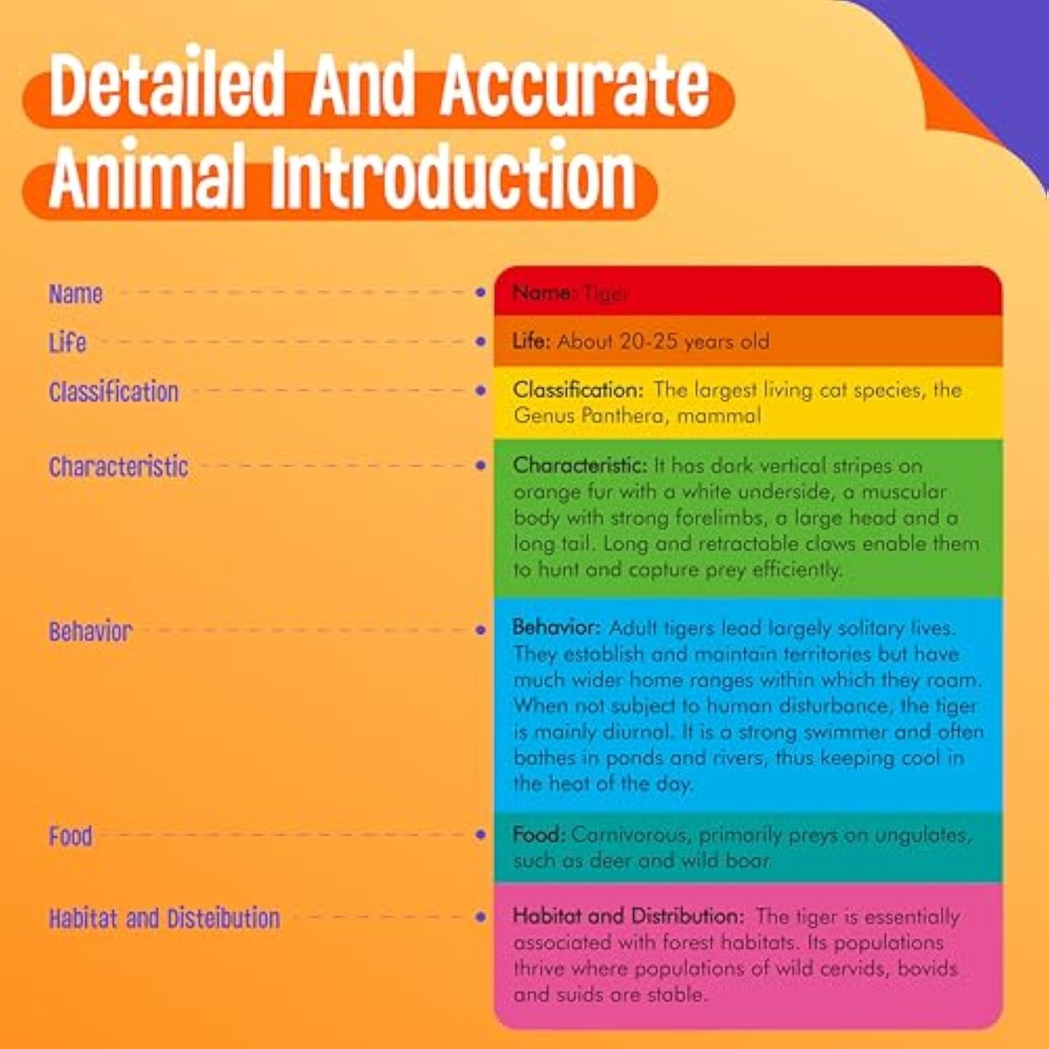 | Value Pack: The Montessori Toy Set Comes With 15 Safari Animal Figures And 15 Introducing Flashcards, Helping Expand Children'S Knowledge About The Animal Kingdom. Let Your Little Ones Explore The Fascinating World Of Animals While Having Fun And Learning At The Same Time. | | 15 Safari Animal Figurines: This Set Includes A Variety Of Safari Animal Figures, Such As Lion, Giraffe, Elephant, Zebra, Brown Bear And More. Each Figure Is Meticulously Crafted With Vibrant Colors And Realistic Details, Making Playtime Even More Exciting And Engaging. | | 15 Double-Sided Matching Cards: Accompanying The Animal Figures Are 15 Double-Sided Introducing Flashcards, One Side Is Vivid Image Of Animal And Another Side Is Essential Information About Relevant Animal. From Their Names And Habitats To Interesting Facts, These Flashcards Promote Early Learning. Each Card Measures 6” X 4“ | | Compact Portable: The Animal Figurine Is Handy And Lightweight, Its Portability Provides Chances To Learn Anywhere. Children Will Be Happy To Play Matching Games During The Trip, Take It To School To Share With Their Friends. They Are Perfect For Both Individual Play And Interactive Play With Friends Or Family, Encouraging Social Interaction And Cooperative Play. | | Educational Toys: It Is Not Only Great For Imaginative Play But Also For Educational Activities. Use Them To Teach Animal Names, Categorize Different Species, Or Create Storytelling Adventures. The Possibilities For Learning And Creativity Are Endless. | |