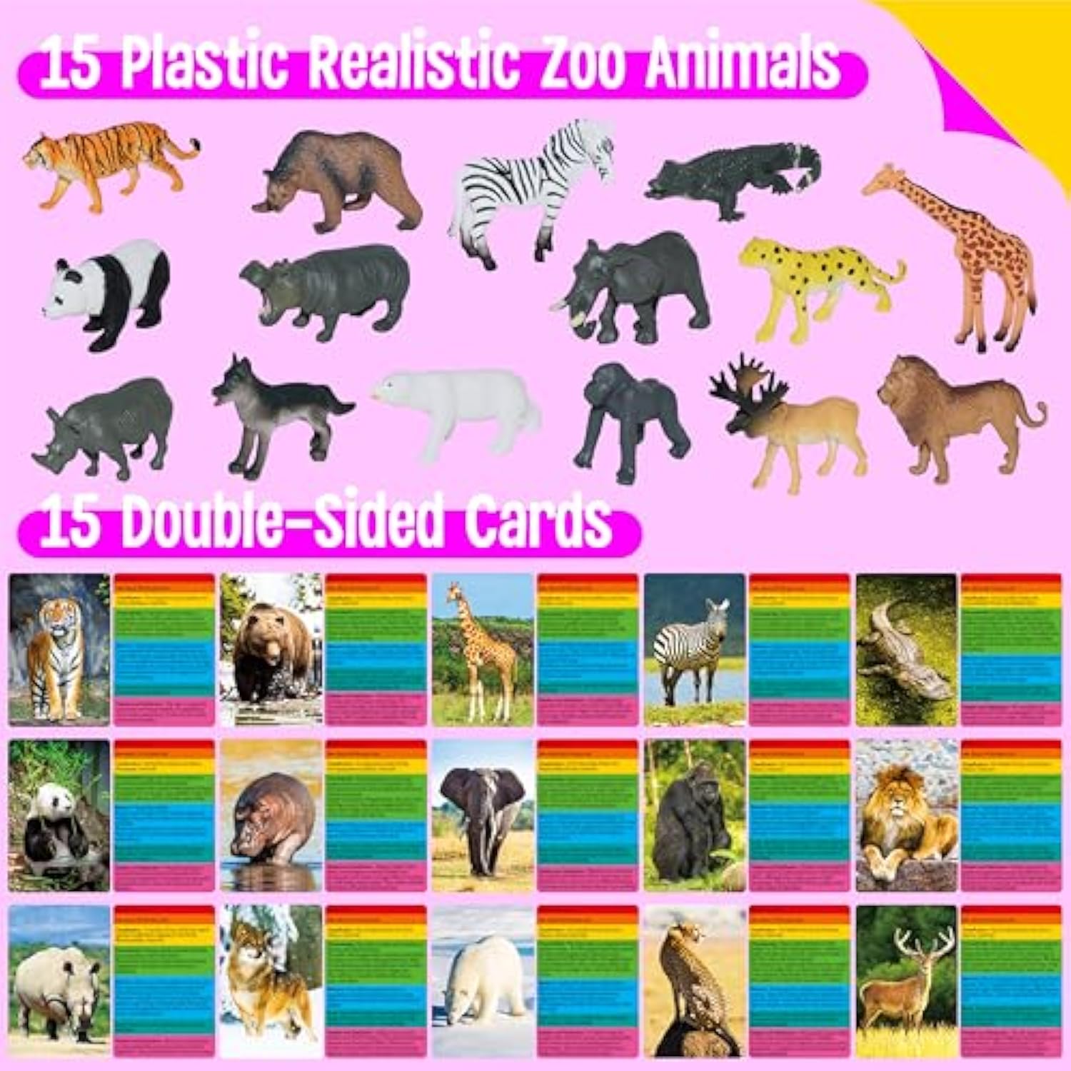 15 Pcs Safari Animal Figurines With 15 Introducing Flashcards, Realistic Zoo Animal Figures Montessori Toys Science Educational Matching Game For Homeschool Preschool Toddler Kids