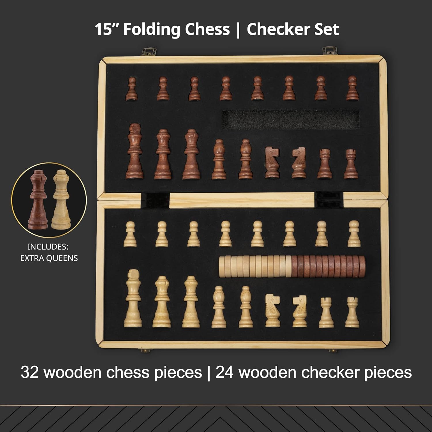 15" Wooden Chess Sets - Chess & Checkers Board Game | With 2 Extra Queens | Wooden Chess Set | Chess Board Set | Chess Sets For Adults | Chess Sets For Adults & Kids | Checkers Game For Kids & Adults
