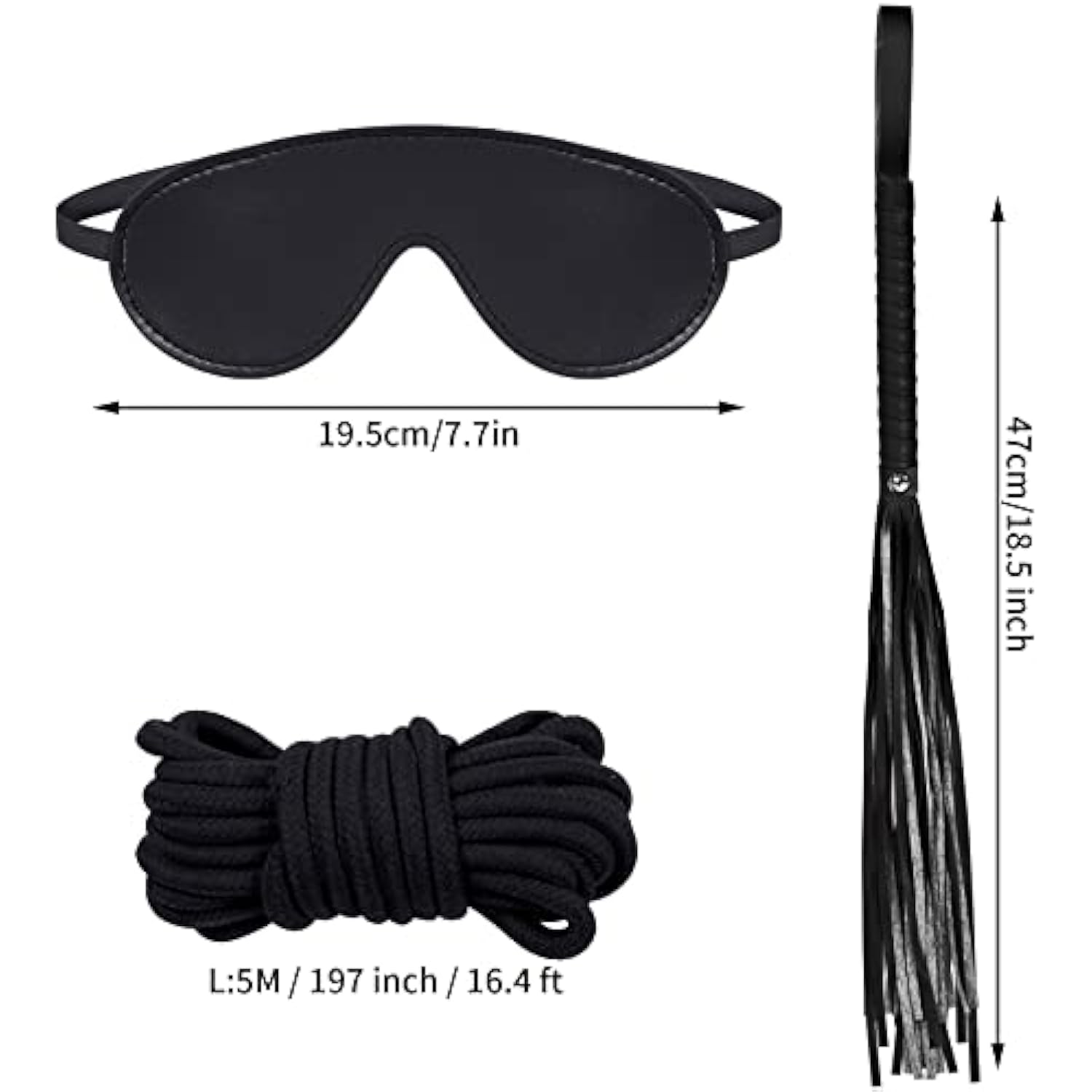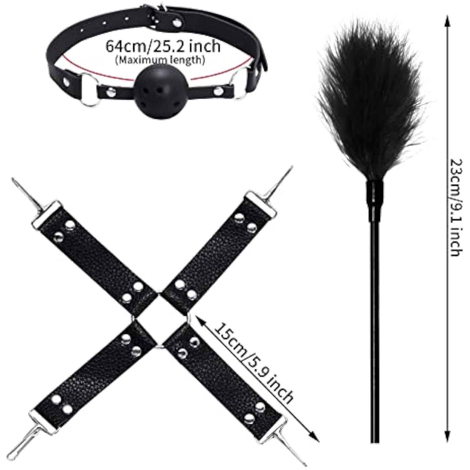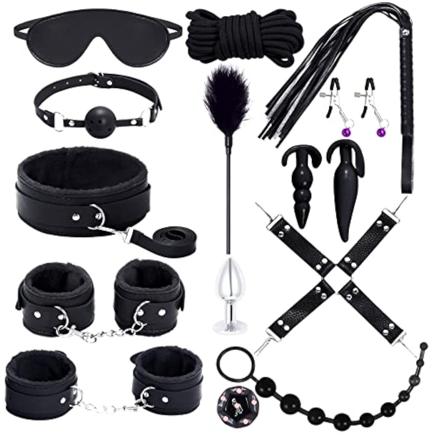 - Valuable Bdsm Restraints Set: You Will Get 1 Pair Of Handcuffs, 1 Pair Of Ankle Cuffs, Collar With Leash, Whip, Blindfold, Cotton Rope, Feather Tickler, 1 Pair Of Nipple Clamps, Ball Gag, Cross Strap, Dice, 4Pcs Anal Plug Toys. Totally 15Pcs Sex Toys Se
