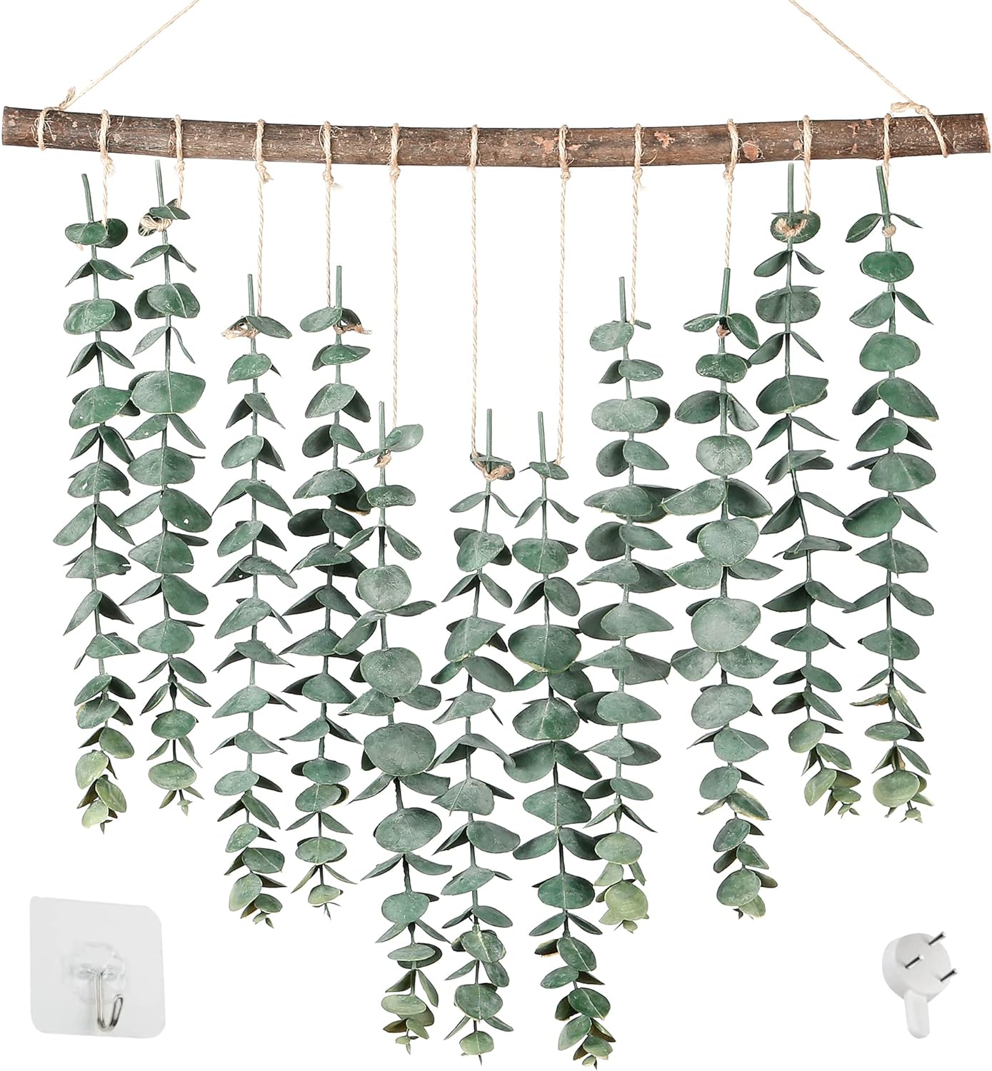 - PREMIUM MATERIAL & SIZE: The eucalyptus wall hanging is made of environmentally friendly plastic, natural hardwood and yellow jute twine. The width of the high quality wooden stick is 17 inches and the length of the artificial eucalyptus plant varies from 11-17 inches. Each item has 11 number of big hanging branches, please feel free to customize according to your need.