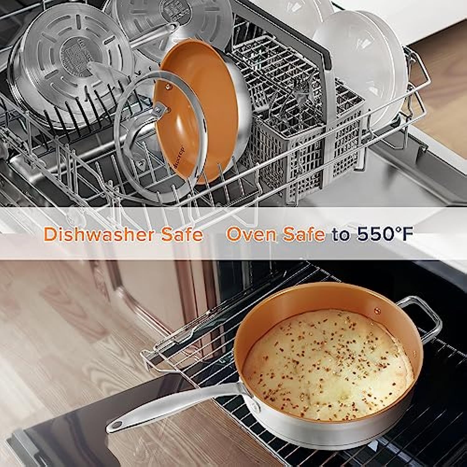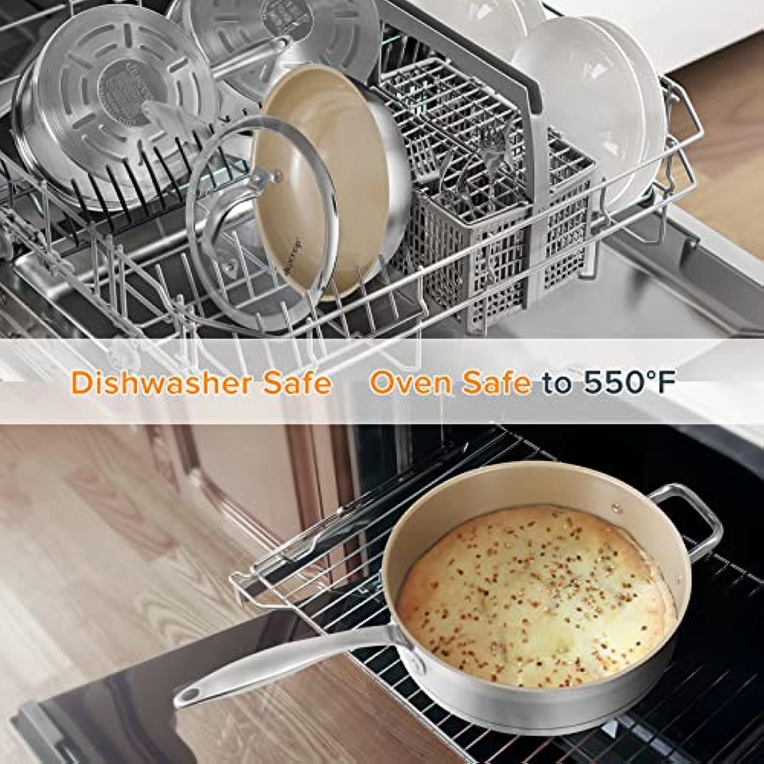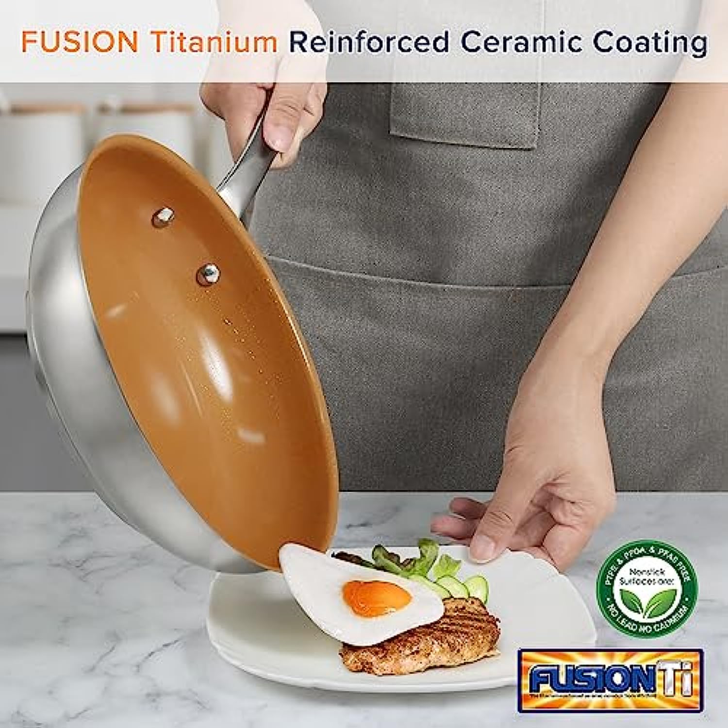 - HEALTHY FUSION NON-STICK COATING: The 8-inch & 9.5-inch fry pan and 11-inch saute pan with lid fuse the healthy benefits of nonstick cooking with the classic style of stainless steel. The interior is coated with a FUSION titanium reinforced ceramic coating from Whitford , that's completely free of PFAS, PFOA, PTFE, Lead or Cadmium. The addition of titanium enhances non-stick properties, increases durability, and ensures better cooking performance.