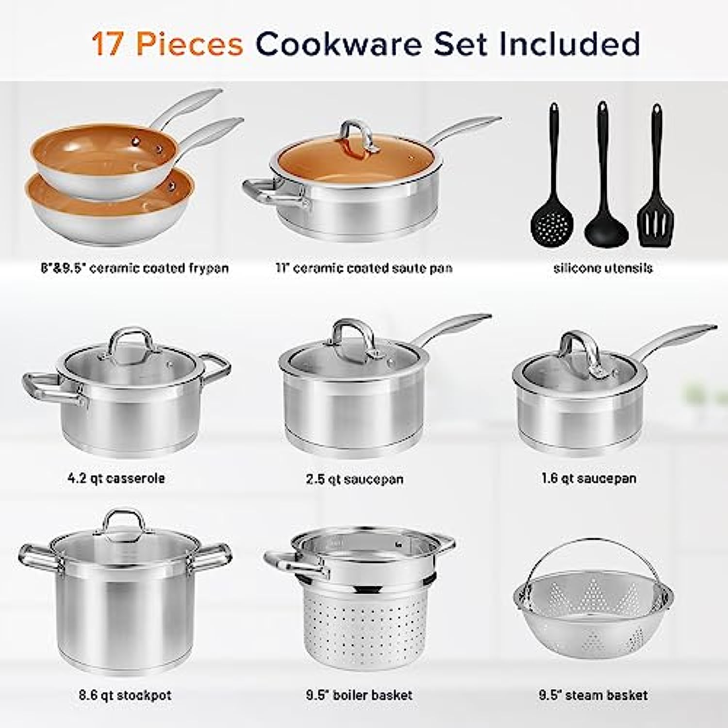 - 17PC KITCHEN COOKWARE: 1.6-qt & 2.5-qt saucepan with lid, 4.2-qt casserole with lid, 8.6-qt stock pot with lid, 9.5-inch boiler basket, 9.5-inch steam basket, 8-inch & 9.5-inch ceramic non-stick fry pan, 11-inch stainless steel nonstick saute pan with helper and lid, 3pcs silicone kitchen utensils, which is comprised of all the necessary cookware pieces for preparing all of your favorite recipes.