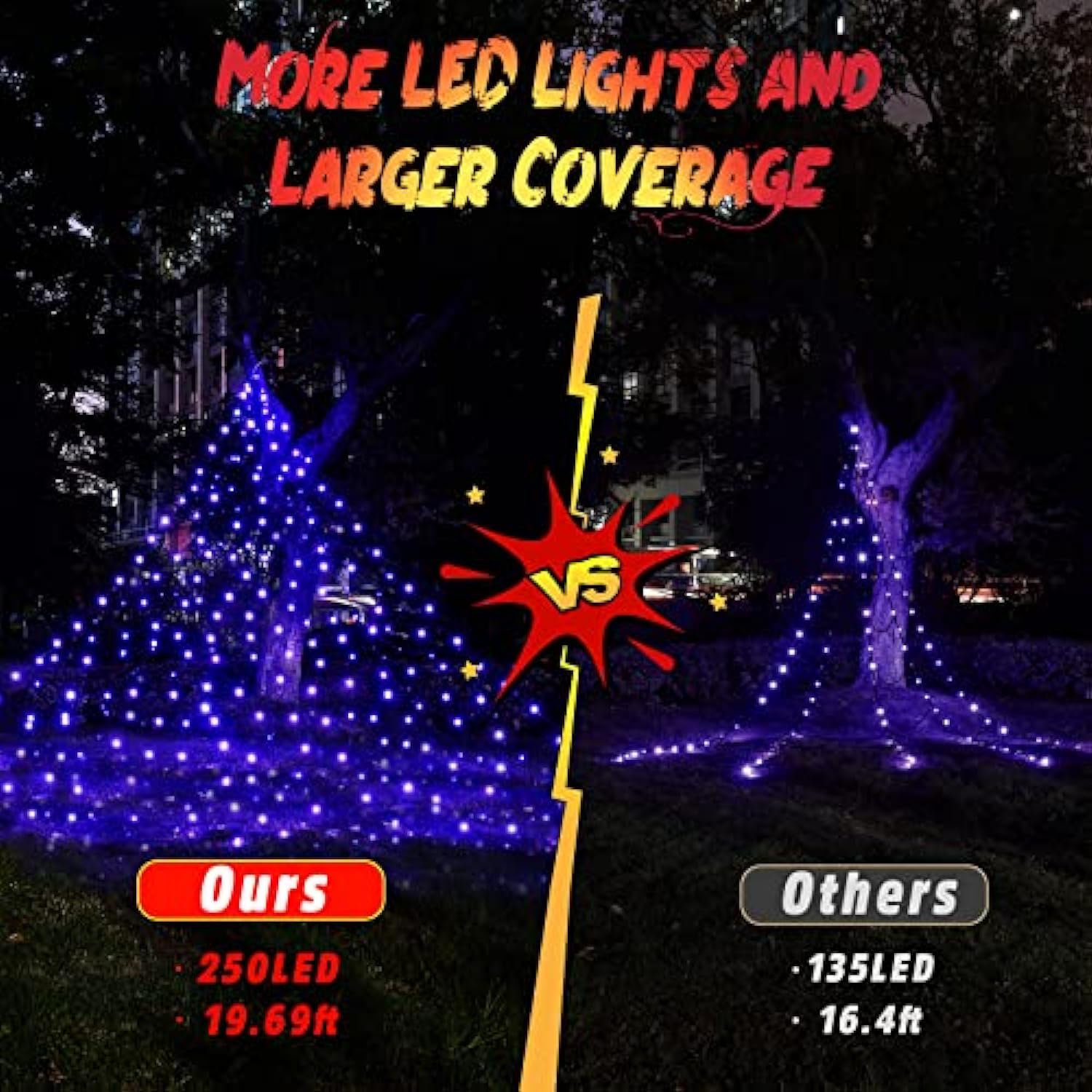 - More Durable and More LED Lights: Our Halloween Triangular web lights are made of thicker and stronger mesh material to ensure that it won't broke apart even if you place big spiders on it. They are built to last longer than others. The spider web has total 250 Purple LED lights, making it brighter and more obvious. Your yard will stand out in the dark.