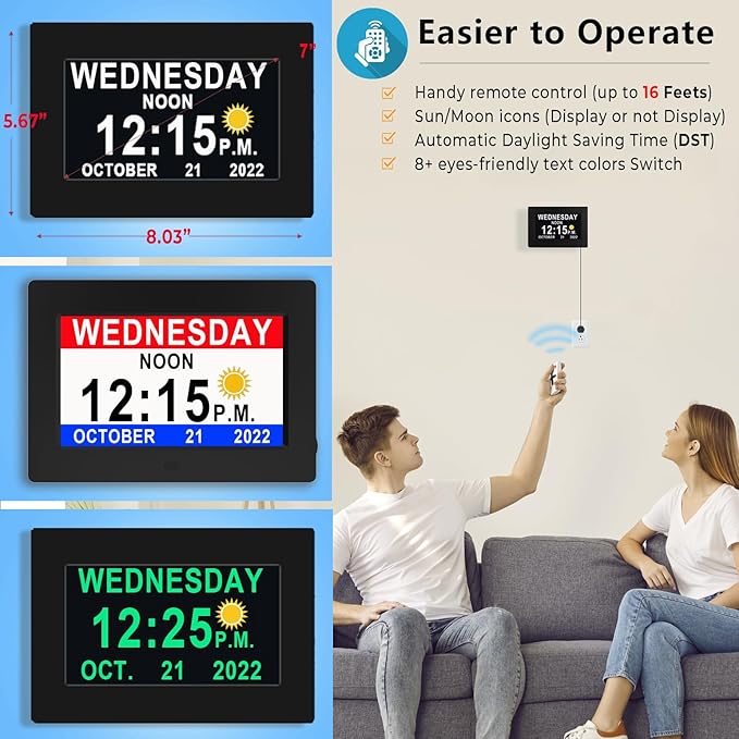 19 Alarms Digital Clock with Voice Talking Time, Auto DST, 20 Custom Reminders, 10-Level Auto Dimmer, 6 Display Modes, Day Date Calendar Clock for Seniors Dementia Alzheimers'- 7 Inch with Remote