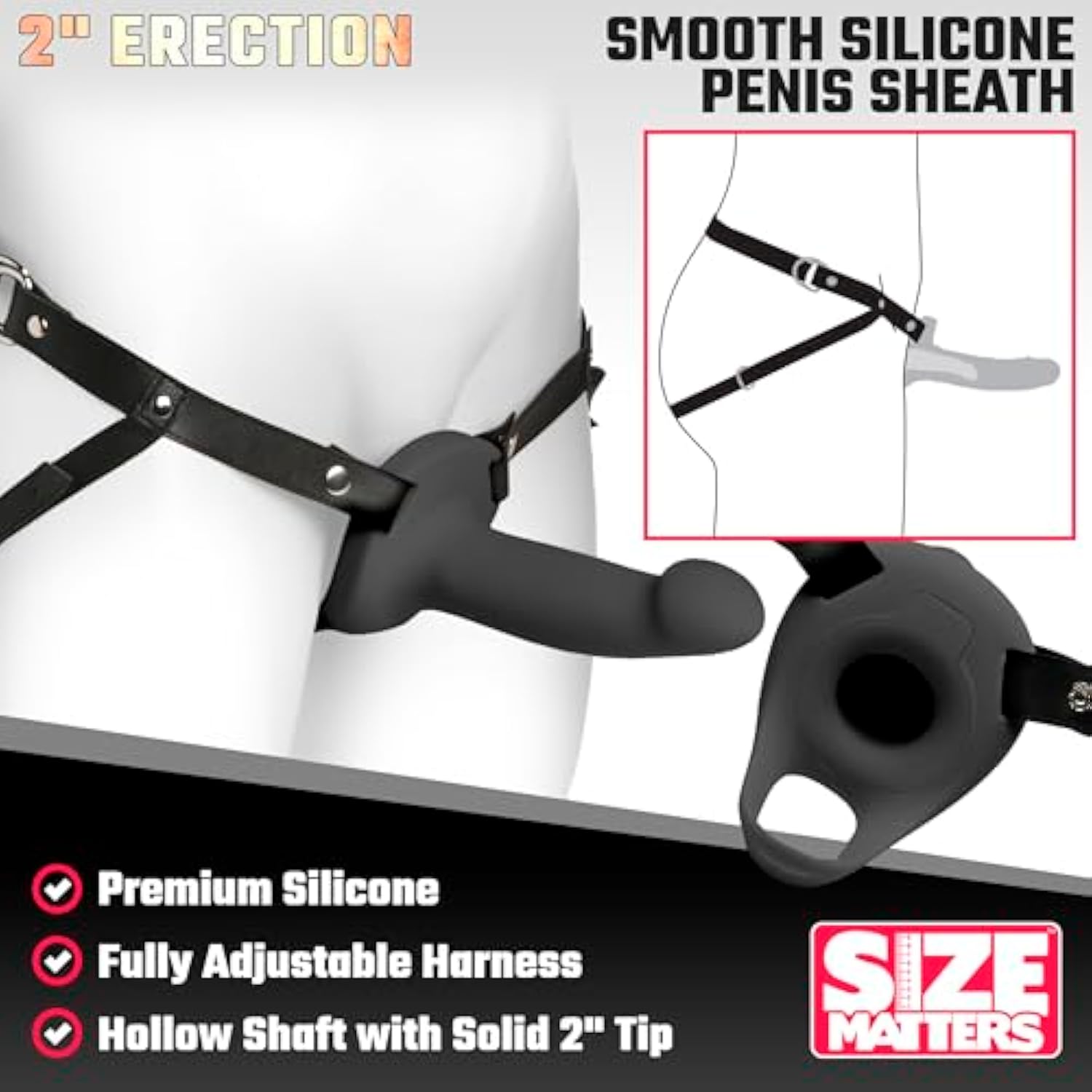 Hollow Body With Solid Tip And Ball Ring: Insert Your Penis Into The Hollow Sheath. At The End Of The Sheath Is A 2 Inch Tip With A Round Head That Adds Length Along With The Girth Of The Sheath To Your Shaft. At The Base Of The Sheath Is A Stretchy Ring To Wrap Around Your Balls And Help Keep The Sheath In Place. | | Fully Adjustable Harness: Use The Pu Leather Straps And Metal Belt Buckles To Adjust For The Perfect Fit Around The Waist And Thighs. | | Premium Silicone: Enjoy This Silky, Smooth, Premium Silicone Dildo. Use Only With Water-Based Lubricants. | | Fantasy Role Play: Give Your Partner The Experience Of A Bigger, Longer Dong With This Hollow Strap-On! | | Measurements: Harness: Waist Adjusts Up To 48 Inches In Circumference. Thighs Adjust From 13 Inches To 27.5 Inches In Length. Dildo: Insertable Length: 6.3 Inches. Widest Insertable Diameter: 1.7 Inches. Inner Depth: 5.5 Inches. | |