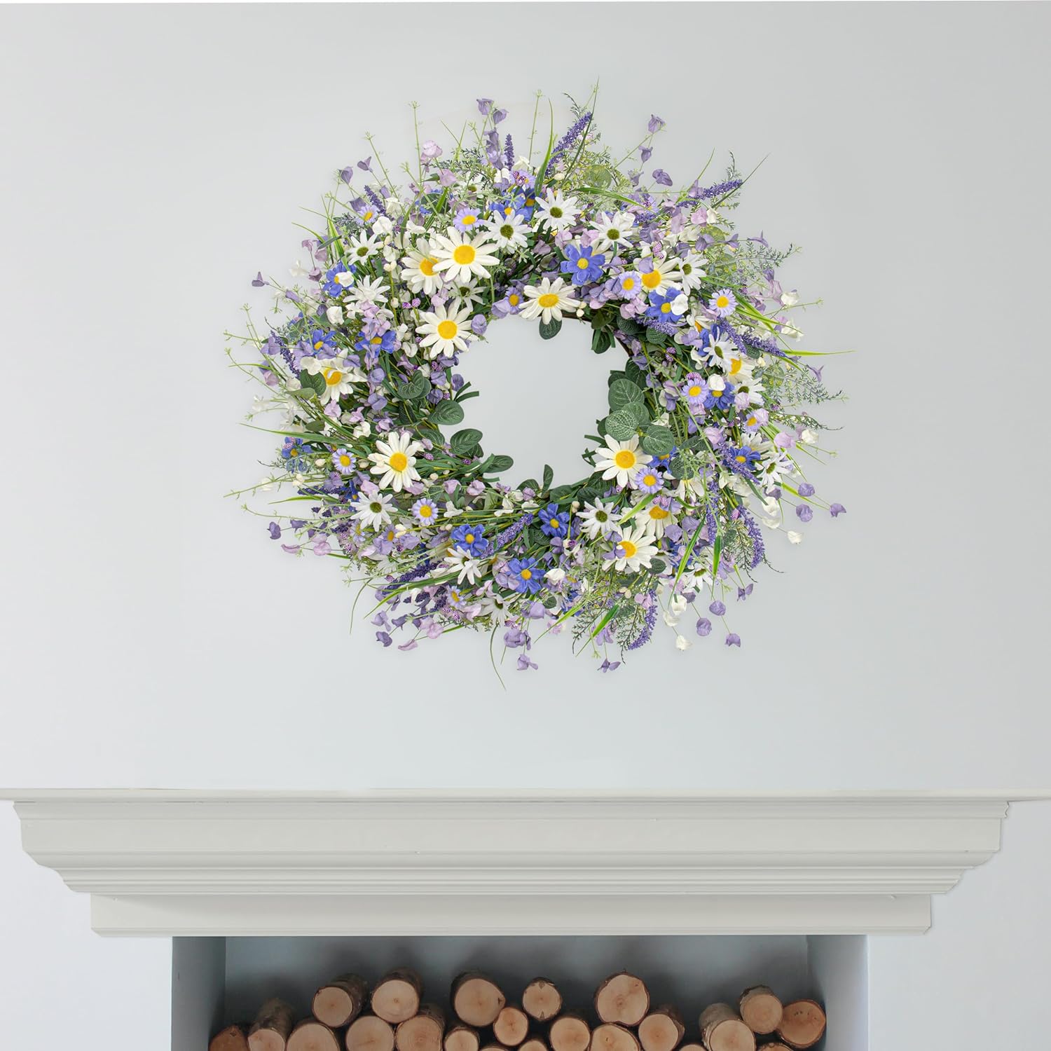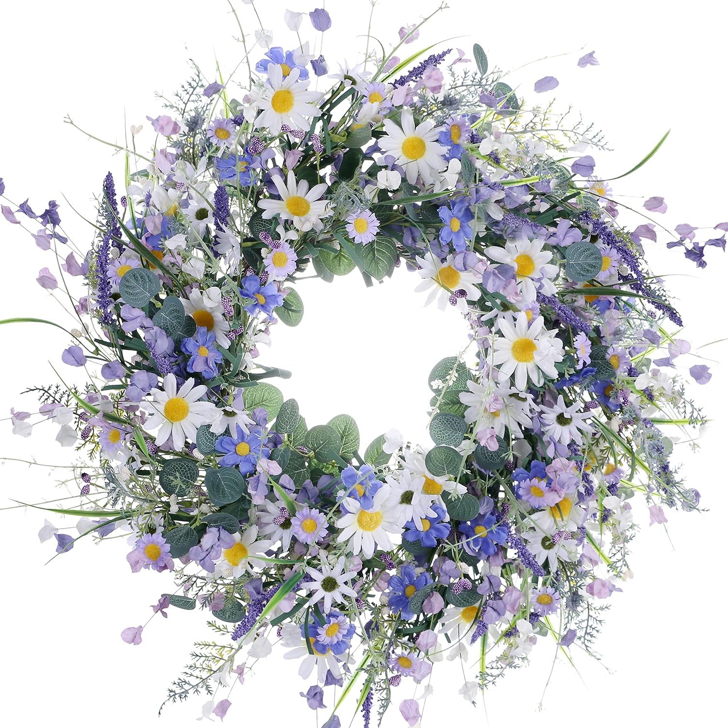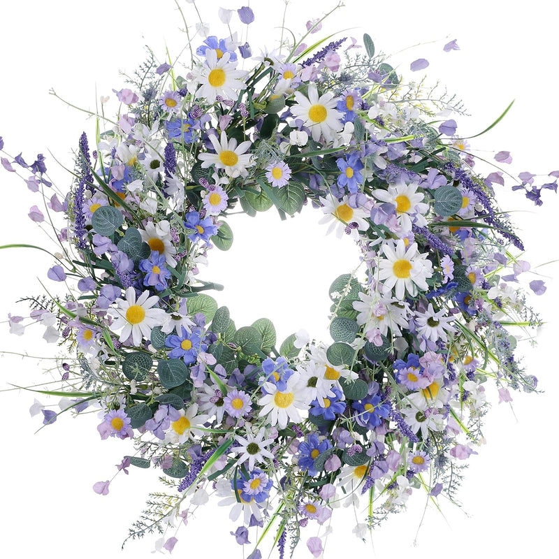 - Designed for Spring:Based on a sturdy natrual grapevine base,this spring wreath is decorated with white and blue daisies,lavender,small wildflowers and green eucalyptus leaves.It is vibrant,vivid, full of spring breath and can make your home closer to spring.