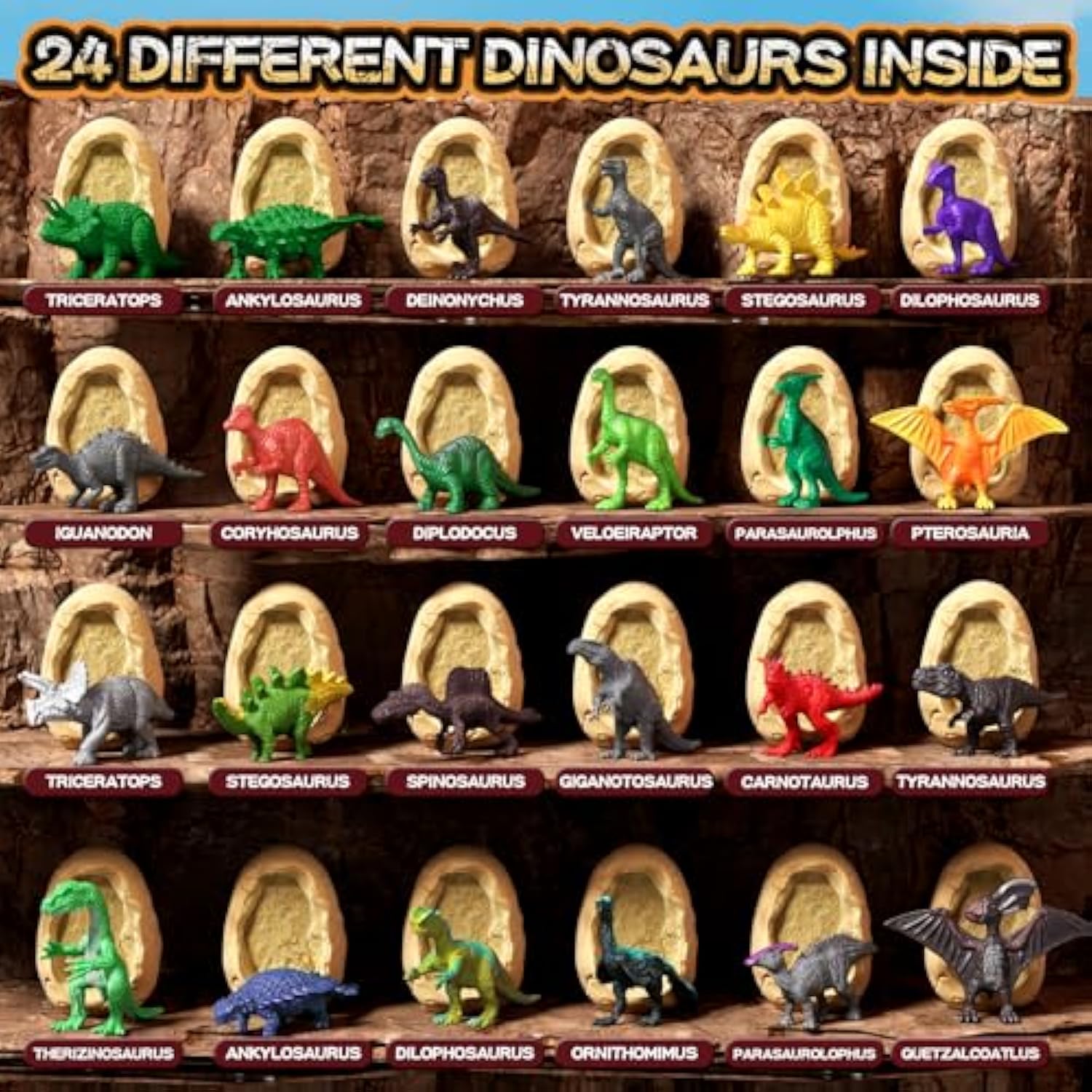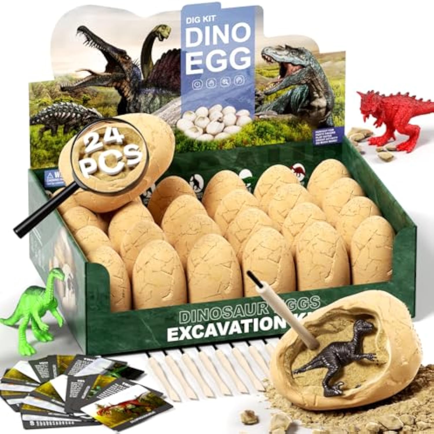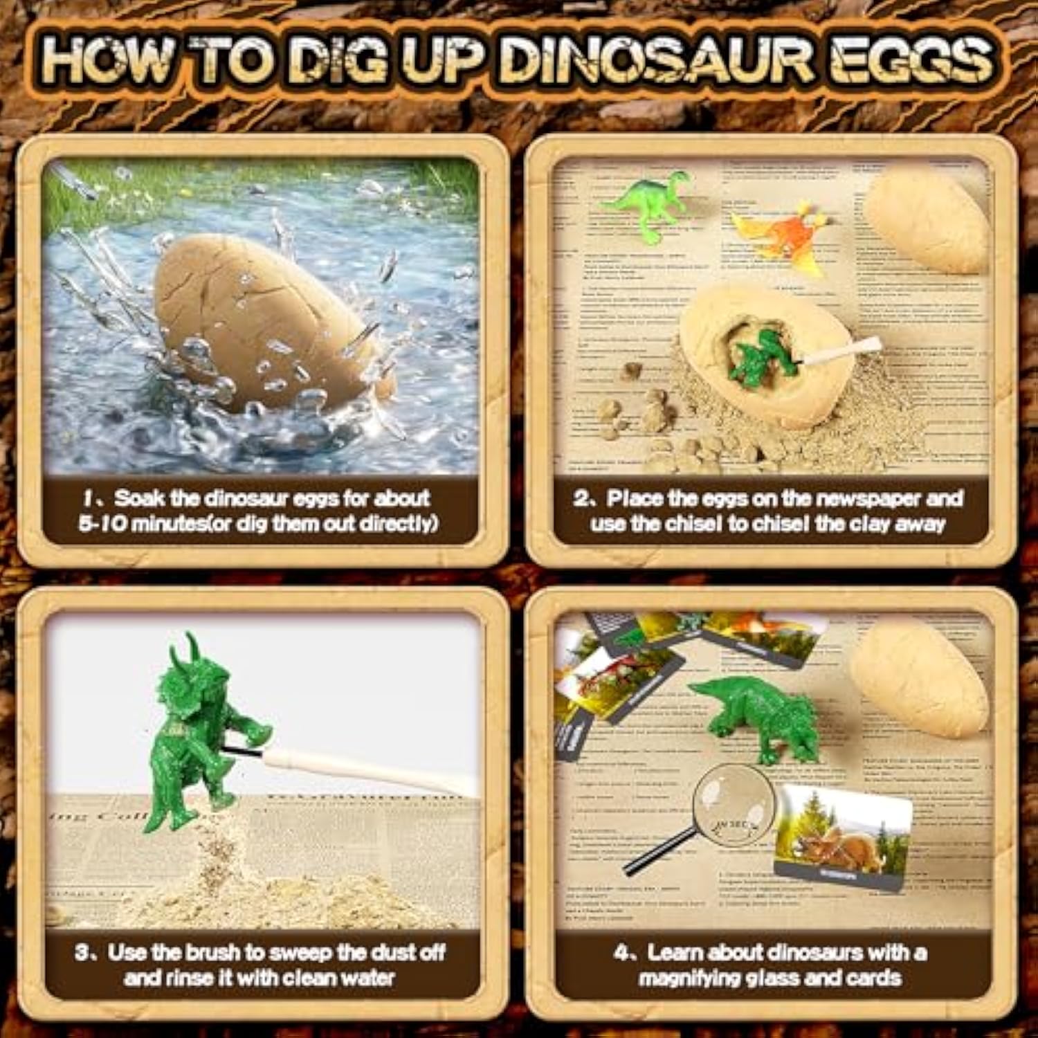 | ?2 Ways Newspaper?Use Our Tools To Dig Up The Dinosaur Eggs Directly, Or Soak The Dinosaur Eggs For 5-10 Minutes Before Digging, Will Be Easier To Dig Up.Before You Start Digging, Spread Out The Newspaper We Provide And Play Archaeological Games On The Newspaper, Which Will Make Your Subsequent Cleanup Work Easier And Less Labor-Intensive. | | ?Magnifying Glass Card?After Digging Out The Dinosaur, You Can Use A Magnifying Glass To Observe The Details Of The Dinosaur And Combine It With The Card To Determine The Name Of The Dinosaur.Package Includes 24 Beautiful Cards, Each Describing The History Of A Different Dinosaur. This Blend Of Fun And Learning Enriches Your Child'S Knowledge Of These Ancient Creatures, Making It A Best Tool For Educational Activities. | | ?Kit Includes?24 Dinosaur Eggs (With A Unique Toy Dinosaur In Each), 24 Chisel/Brushes, 24 Full-Colored Beautiful Learning Cards(One For Each Dinosaur),1 Magnifying Glass,1 Newspaper.Great Set For Individual Play Or As A Group Activity. It Fascinates Children As Soon As They Pull It Out Of The Box And Is A Best Stem Project. | | ?Mystery Dinosaur Eggs?With Dig Tools,Fell Like A Real Paleontologist Excavating Up Unique Toy Dinosaurs. Fun To Guess Which Dinosaur You Are Digging By The Dug Up Body Parts, Eg. A Leg, Part Of The Head Etc.It'S A Hands-On Experience That Develops Patience, Attention To Detail, And Fine Motor Skills. | | ?Educational Gift?This Engaging Kit Is Not Just A Toy But A Gateway To Learning About Paleontology, Science, And History. Play With Your Kids, Inspire Children'S Creativity And Imagination, And Cultivate Their Interest In Science. | |