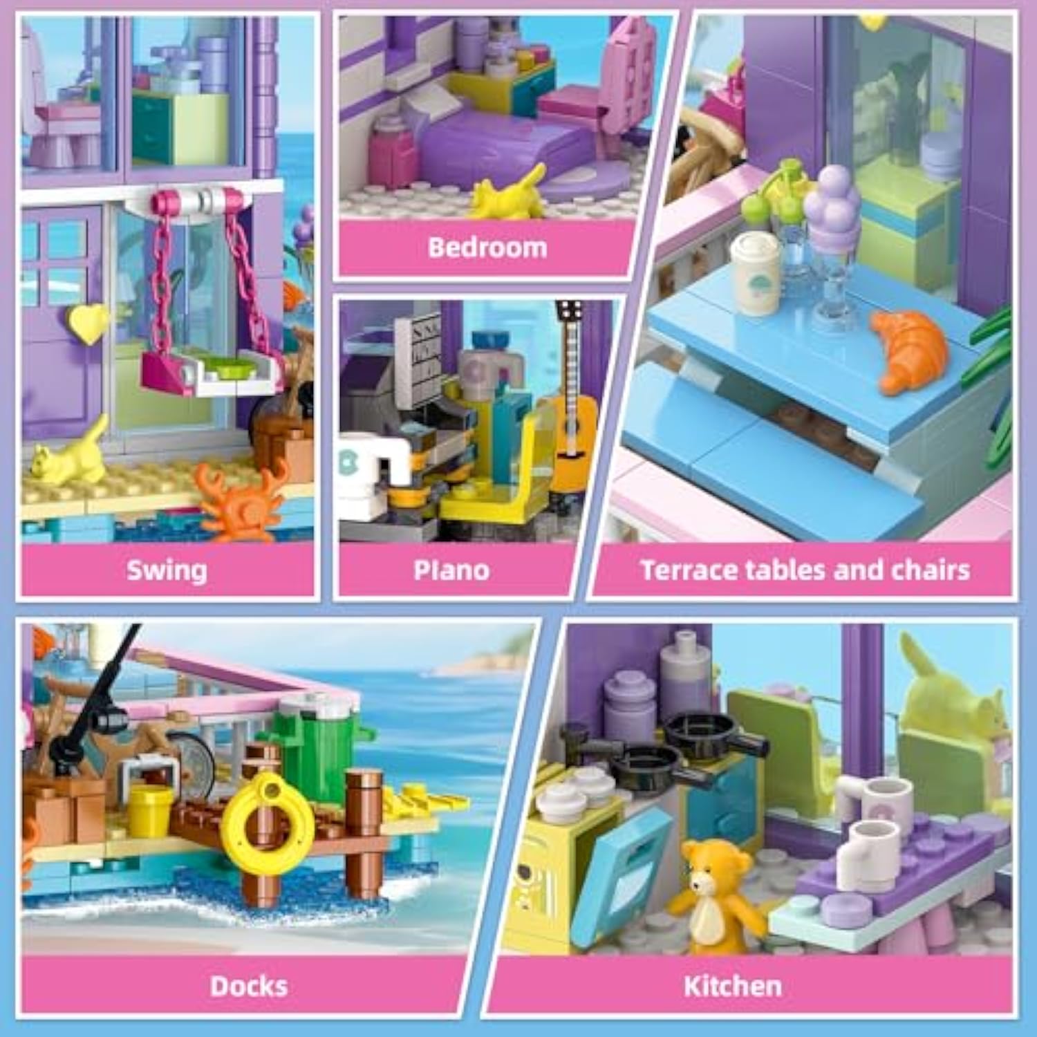| ???Girls 3 In 1 Beach House?This City Seaside Villa Building Kit Has 3 Different Forms Equipped With Realistic Scenes For Creative Play, Featuring A Cozy Bedroom, Kitchen, Sailboat,Palm Trees,Piano,Parasols,Swing,Docks,Terrace Tables And Chairs Etc.Boys Girls Kids Can Imagine Spending A Relaxing Summer Holiday In This Seaside Villa With Playmates And Family, And Act Out Their Vacation Stories | | ???Idea Gift Stem Educational Toy?Packed With Exquisite Packing Box, It Will Be A Great Birthday Or Christmas Gift For Kids Who Love House Building Toys And Imaginative Vacation Play.This 961 Pieces Architecture Building Project Will Offer Friends Girls Kids Aged 6 7 8 9 10 11 12 Years Old Endless Build-And-Play Fun While Help Spark Creative Imagination, Logical Thinking And Cultivate Concentration | | ???City Villa Street View Display Model At Home?The Pink Girls Holiday Cottage Building Toy Model Has 3 Different Forms.Adults Or Kids Can Choose One Of Their Favourite