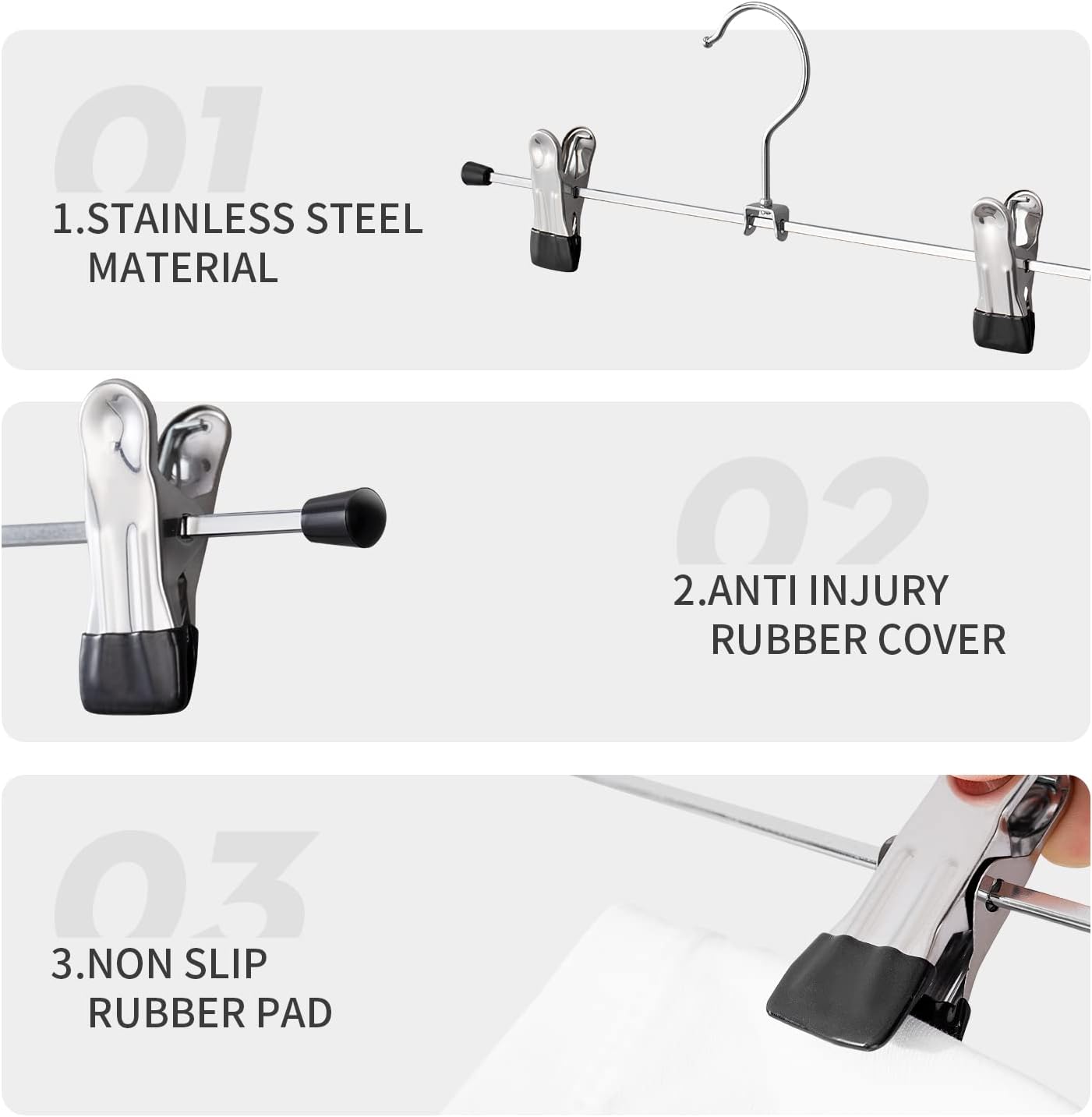 - STRONGER GRASPING BUT NO SCAR - The trousers hangers each clip has 4 turns of spring offer stronger griping to fix clothes and shorts, even silk fabric will not worry fall.Trouser hangers with rubber coating on the clip adds friction without leaving marks on clothes.These pants hangers for men are an excellent choice for hanging your clothing.