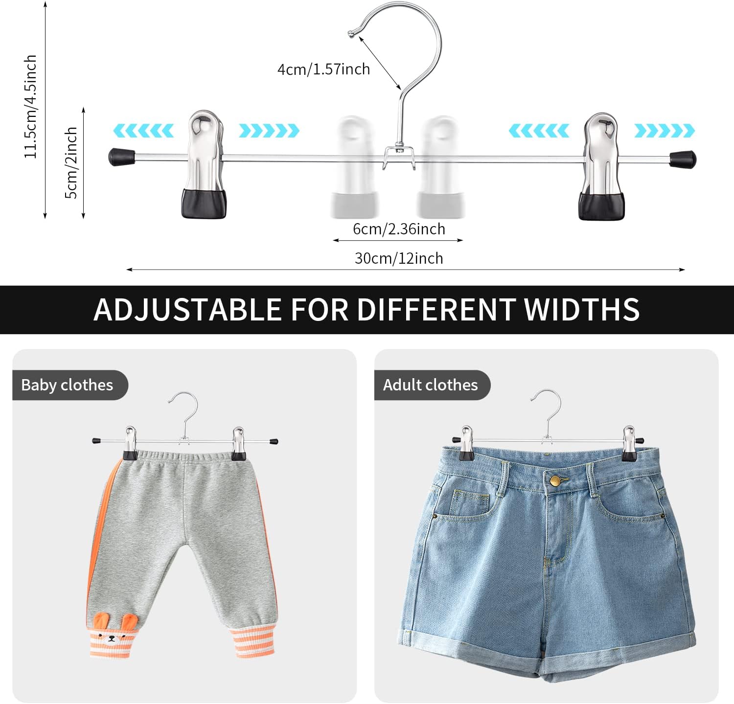 - ADJUSTBALE PANTS HANGERS WIDTH CLIPS - The metal pants hangers with clips can be freely adjusted for your clothes size.Freely hang all ages and different sizes of pants whether it is baby's or adult's clothing.Those pant hangers for men is so practical for pant,jeans,skirt,kids clothes,shorts,underwear,socks,Yoga pants,leggings ect.