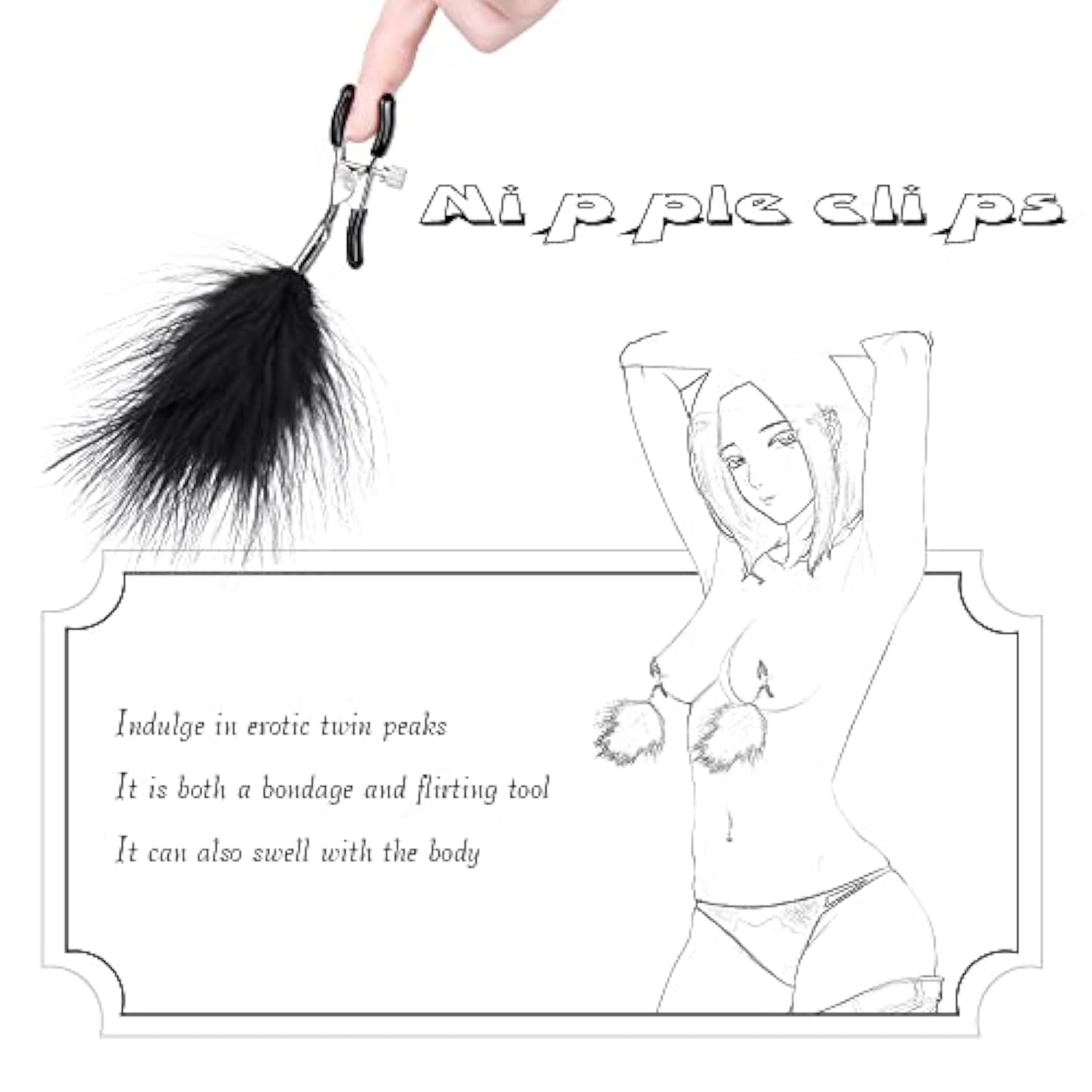 3Pcs Adult Sex Flogger, Fluffy Metal Handcuffs With Keys, Feathered Nipple Clamps Plush Stainless Steel Wrist Cuffs Cosplay Couples Bdsm Beginner Kit (Black)