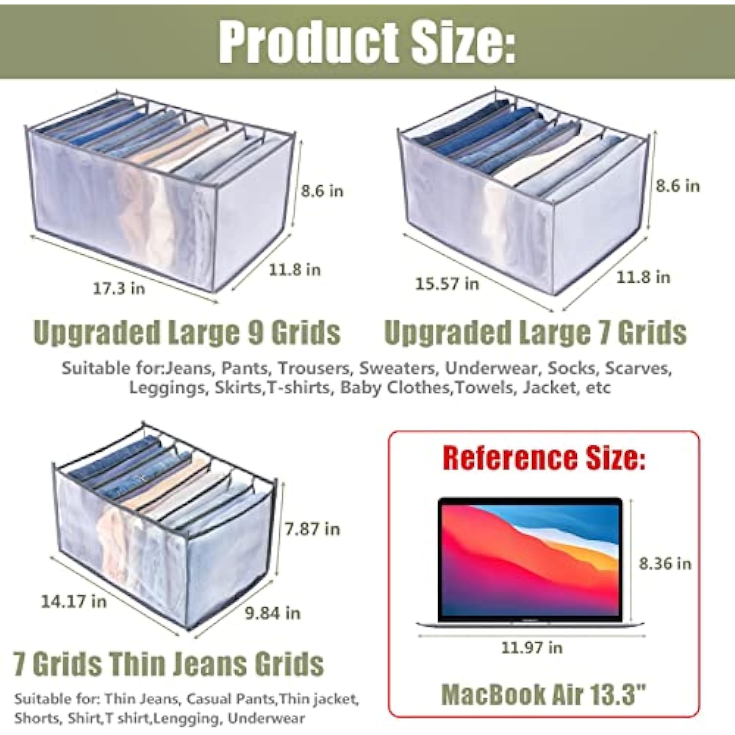 - Size of Organizer: The storage box has 3 size designs, which can meet all your storage needs and can solve most of the daily clothes storage problems. (7 Grids Thin Jeans Grid Size:14.17*9.84*7.87 inch; Upgraded 7 Grids Jeans Grid Size: 15.57*11.8*8.6 inch; Upgraded 9 Grids Jeans Grid Size: 17.3*11.8*8.6 inch).