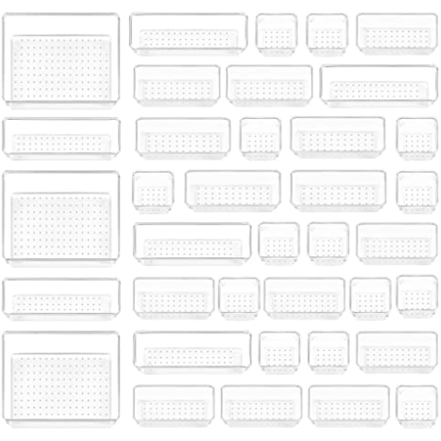 - Combination of 4 Different Sizes ---- One set includes 37pcs storage bins in 4 different sizes, which makes you can customize combinations to store items and organize drawer for your specific needs. Includes: 9 x 6 x 2 inches (3pcs), 9 x 3x 2 inches(6pcs), 6 x 3 x 2 inches(14pcs), 3 x 3 x 2 inches(14cps).