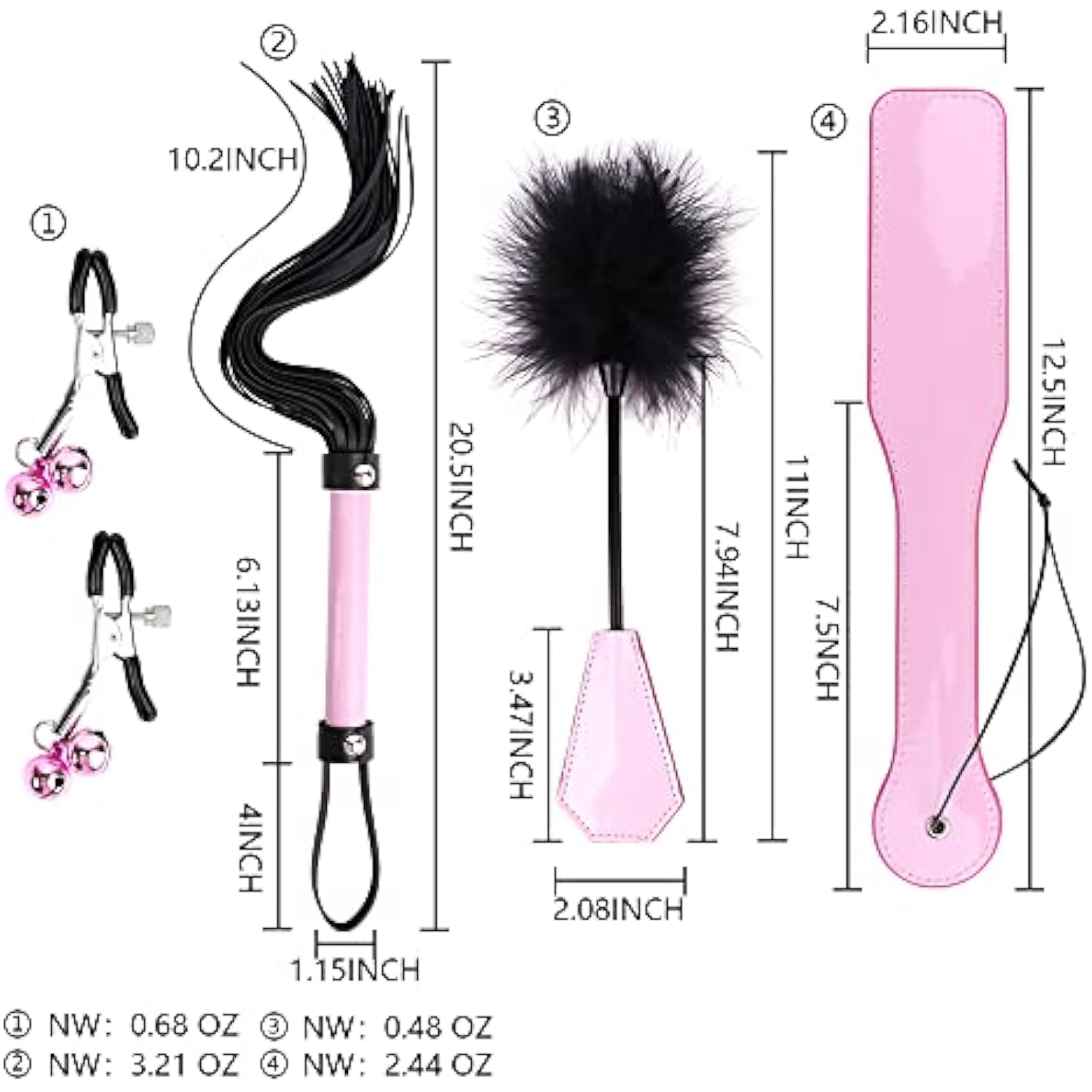 4Pcs Sm Bondage Set Sex Whip Adult Paddle Slap Leather Whip Flirting Feather Tickle And Bells Nipple Clamps For Adults Sex Games (Pink)