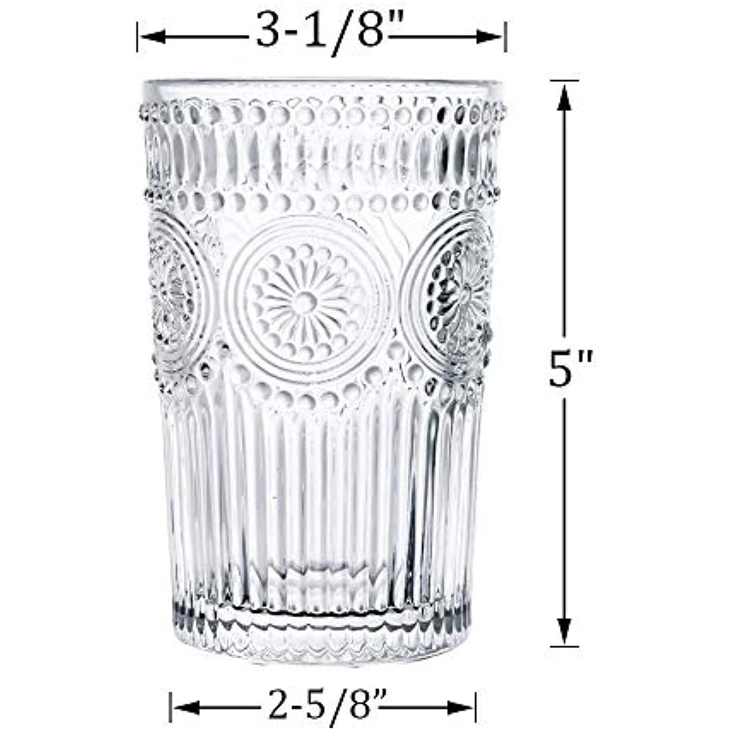 - Set of 6 drinking glasses, measures 3-1/8"Diam x 5"H, 12 oz capacity. It also a distinctive gift.