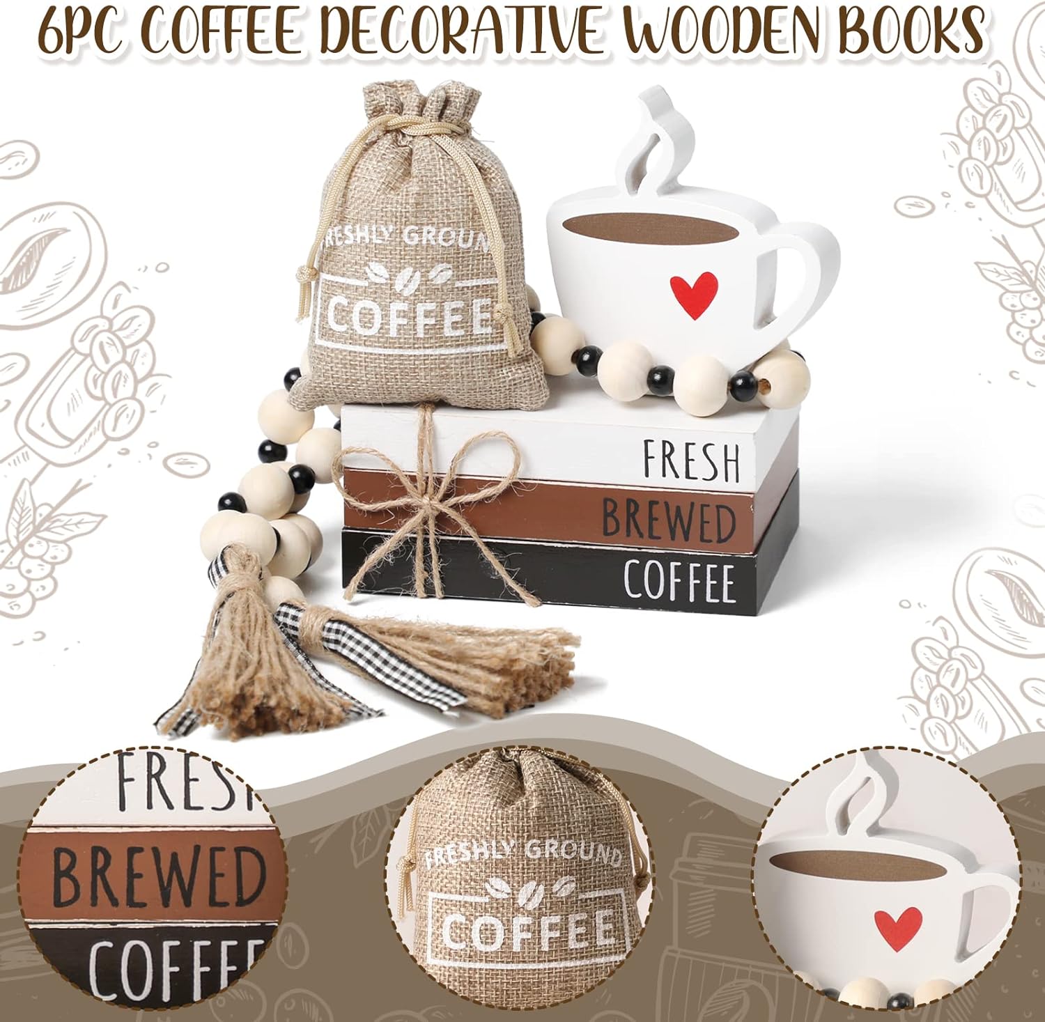 6 PCS Coffee Bar Decor Mini Coffee Bar Accessories Coffee Bar Sign Coffee Tiered Tray Decor Coffee Wooden Book Stacks Rustic Farmhouse Coffee Table Sign