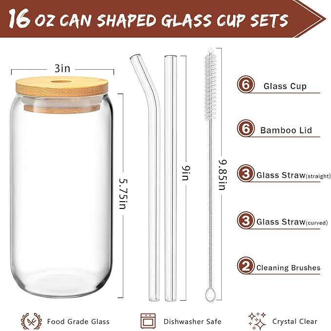 - [ENHANCED DRINKING PLEASURE] Glass cup set includes 6 can shaped glass cups, 6 bamboo lids, 6 glass straws and 2 cleaning brushes. Designed with the smooth and pleasing contours of the similar traditional aluminum can, it is definitely the ideal container for iced coffee, beer, cocktails, milk tea, soda, juice and any beverage you can think of.