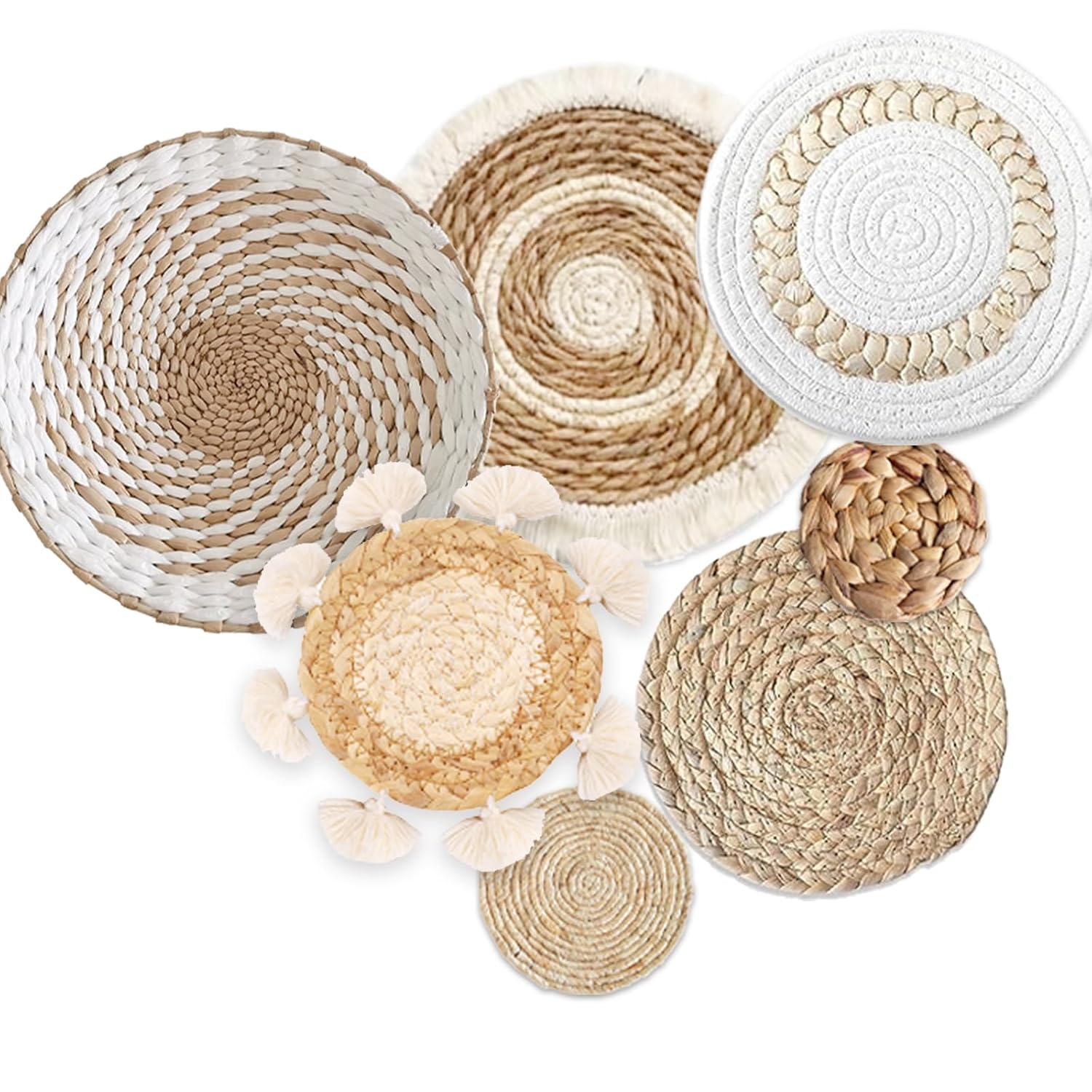 7 Pack Boho Wall Basket Decor - Seagrass Rattan Wicker Wall Decor Round Handmade Hanging Rustic Flat Elegant Wall Art for Farmhouse Living Rooms Bedrooms Display Table Settings Kitchen Home