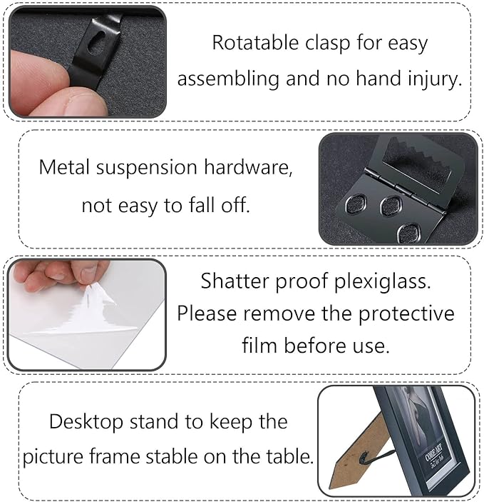 - 【Back】: Spring style action is easy to use, metal hanging hardware and 45-degree brackets allow the frame to be mounted horizontally or vertically to a wall or tabletop