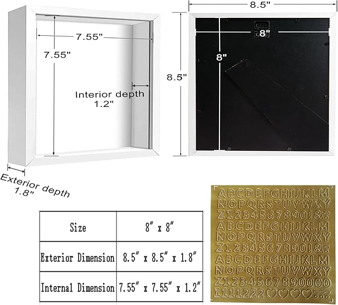 - Size: The white shadow box frame 8"x8" with an exterior depth of 1.8" and an internal dimension of 7.55"x7.55" with an interior depth of 1.2". And the packaging includes 1 sheet gift letter stickers.