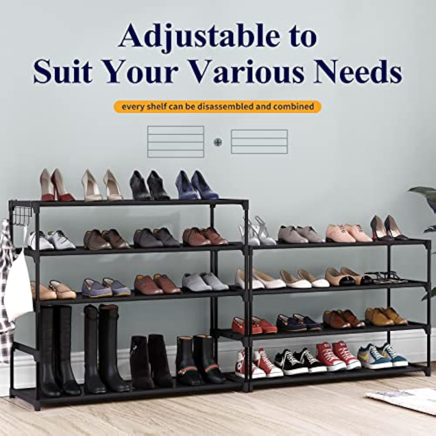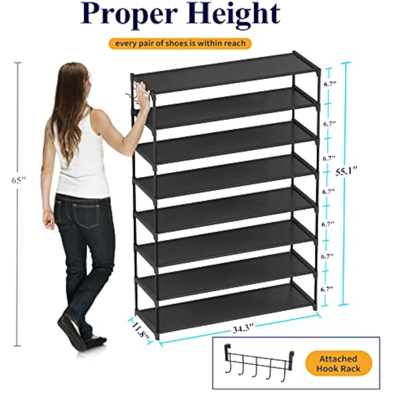 - LARGE CAPACITY: The Kisture 9-tier closet shoe rack organizer (34.3'' L x 11.8'' W x 55.1'' H) with its 6.7'' tier space can house 36-45 pairs of shoes of all styles. Its 11.8'' depth accommodates even shoes up to US size 12! This tall shoe rack includes a hook rack that provides extra space for bags, keys, and other accessories.