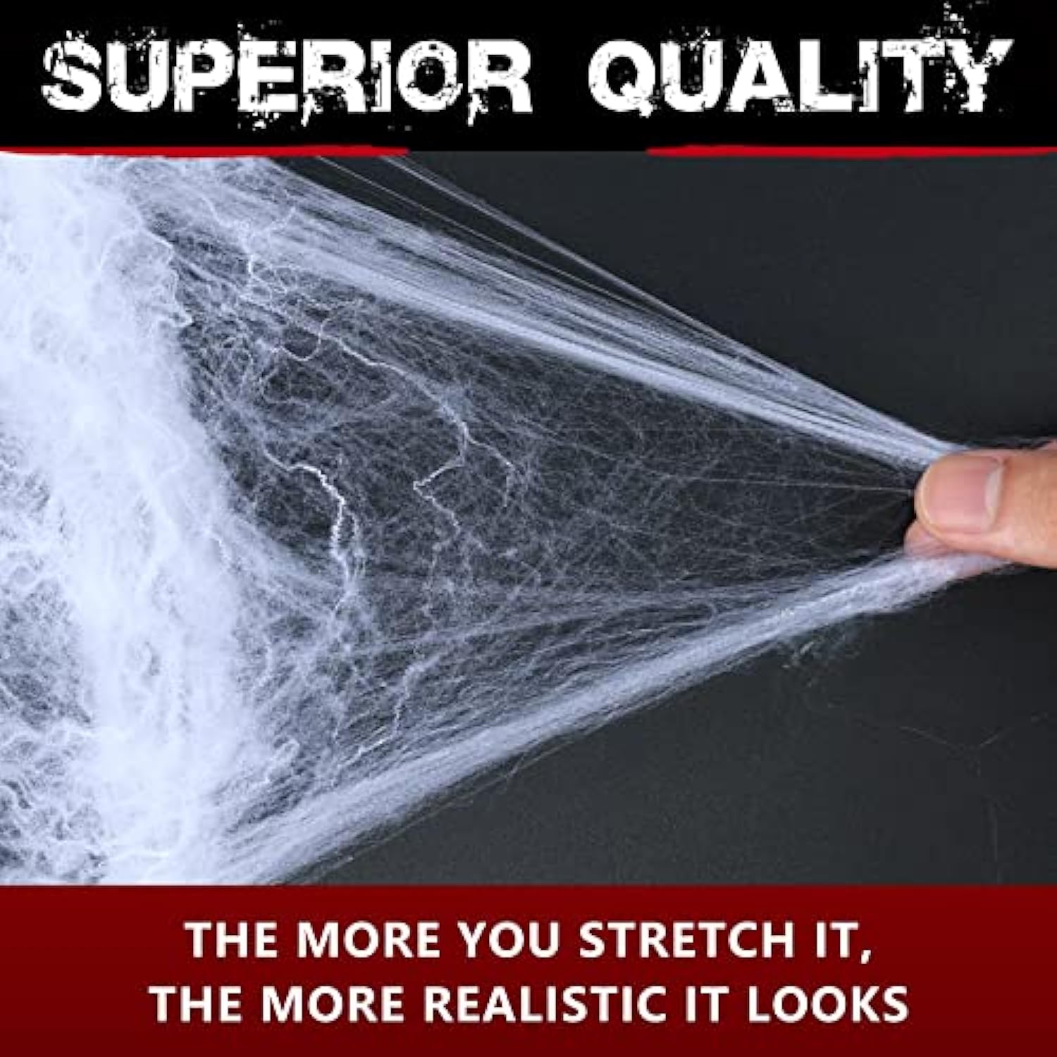 - More Super Stretch Cobwebs: 270g (9.5 oz) Ultra-stretchable webs are enough to cover 900 sq ft. of your house indoor & outdoor, weaving all over windows, walls, and furniture etc. Made of soft material, hand-knotted and durable, flexible to be pulled into any shapes you want, the more you stretch the spiderweb, the more realistic it looks. Easy to clean up and will not damage your furniture.