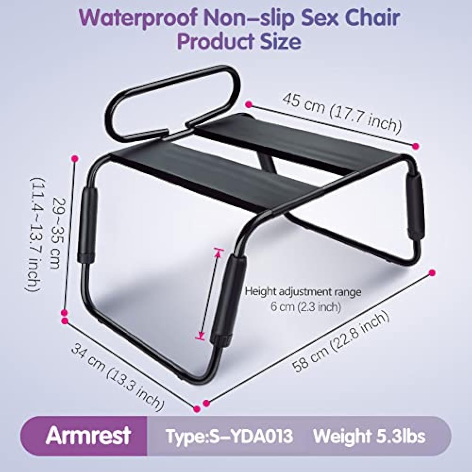 | Experience More Novelties Sex Positions: The With Armrests Sex Chair Can Assist Male And Female Couples To Achieve More Interesting And Exciting Sex Positions From Various Angles During Sex Games. Provides Deeper Penetration And An Exciting Sexual Experience You'Ve Never Had Before, Whether It'S Oral, Vaginal Or Anal Sex, A Sex Chairs Can Provide The Best Aid | | High Quality Workmanship And Materials: The Main Body Is Made Of High-Strength Stainless Steel Tubes, And The Two Parallel Bandages Are Upgraded To Be Super Elastic And Waterproof. Allows You To Use It In The Bathroom Too. The Height Can Be Adjusted Freely, The Whole Thing Is Sturdy And Durable, And Has Enough Load-Bearing Capacity To Withstand A Weight Of 300 Pounds, So You And Your Partner Can Use It With Confidence | | Sex Body Positioner: Supported By Two High-Strength Elastic Bandages, You Don’T Have To Rely Too Much On Your Feet To Support Your Body And Share The Weight. The Elastic Bandage Will Make The Body Rise And Fall Automati