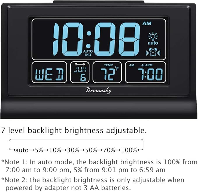 - Large Display with Full Range Dimmer: 5 inches Large LCD screen with nice eye care number display. Time, date and temperature display. Almost full range brightness settable (6 levels + auto dim ), you can easily change to have the view bright or dim it to extremely low.