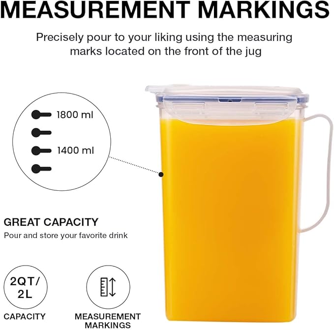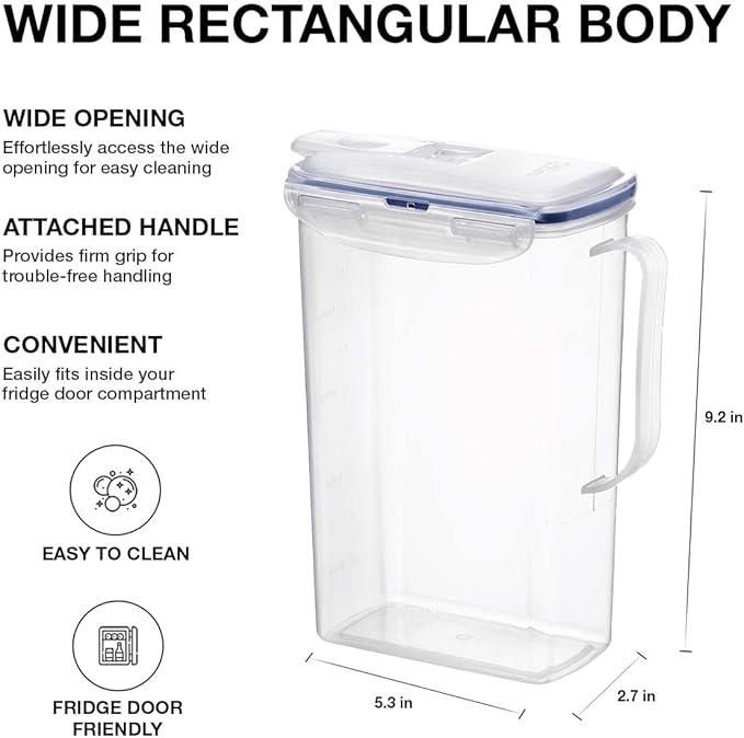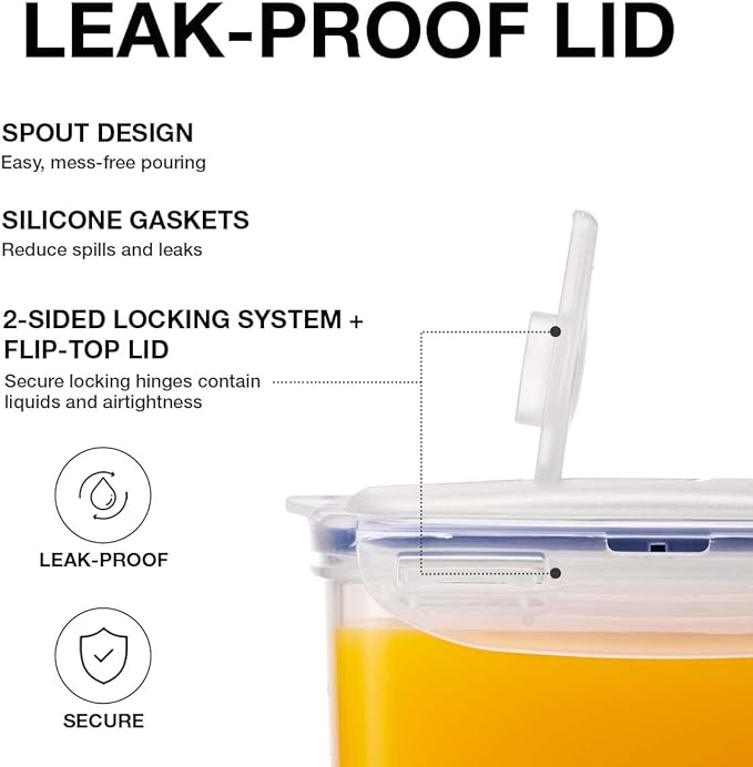 - Leakproof: Fridge Jug is leakproof, airtight, and watertight. Our patented 2-sided hinge locking system and silicone sealed flip top lid prevents spills and keeps drinks/beverages fresh.