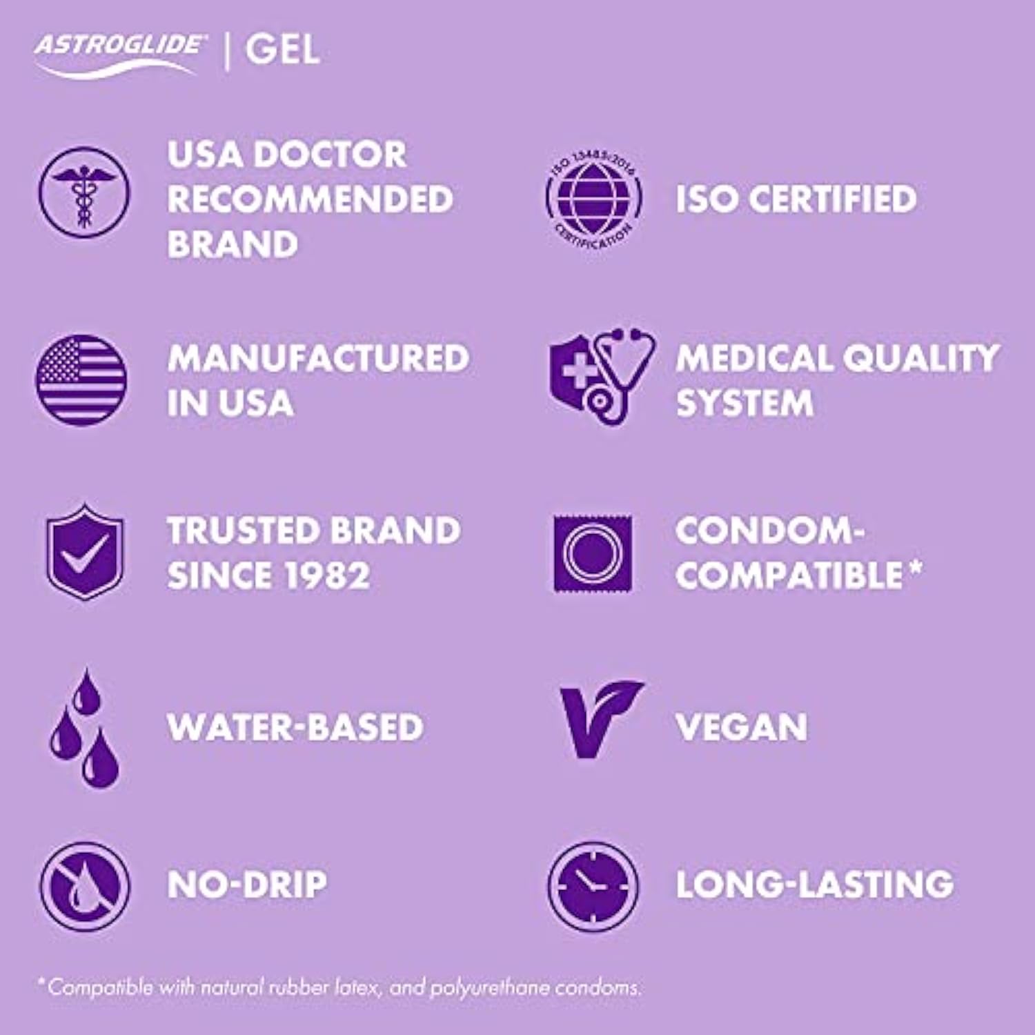 | Personal gel lubricant - a thicker formula than liquid Astroglide | | Enhances comfort and ease of intimate activity, long lasting | | Water-based, water-soluble, hormone-free, petroleum free, no worries about the effects of hormones or petroleum, easy to wash off | | Recommended to alleviate discomfort from vaginal dryness | | Condom and latex safe | |