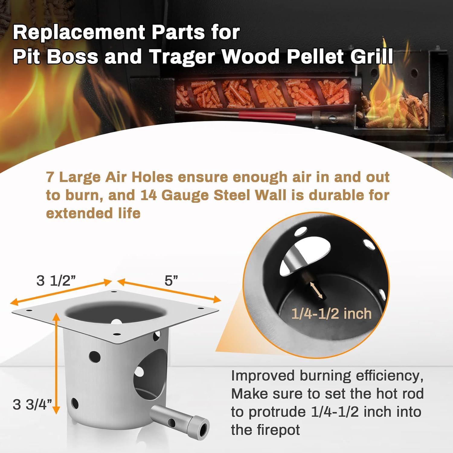 - 【High quality material】:Traeger Grill Parts of Fire Burn Pot of pit boss pellet grill parts is designed with 7 Large air holes. pit boss grill parts 5" x 3 1/2" x 3 3/4". Traeger Replacement Parts Hot Rod Ignitor uses 200W/120V wire lead High density cartridge heating element,Traeger Replacement Parts Hot Rod Ignitor length 30", traeger parts replacement hot stick length : 3.7". traeger replacement parts fan uses white nylon fan blade, 110V PA66.Auger Motor: 1.6 RPM, 110V 60Hz 2 Pole.