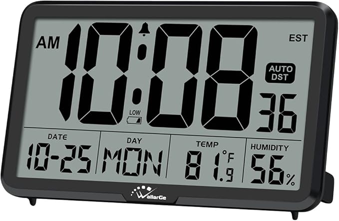 Auto Set Digital Wall Clock Battery Operated, Desk Clocks with Temperature, Humidity and Date, Large Display Digital Calendar Alarm Clock for Elderly, Bedroom, Office, 8 Time Zone, Auto DST.