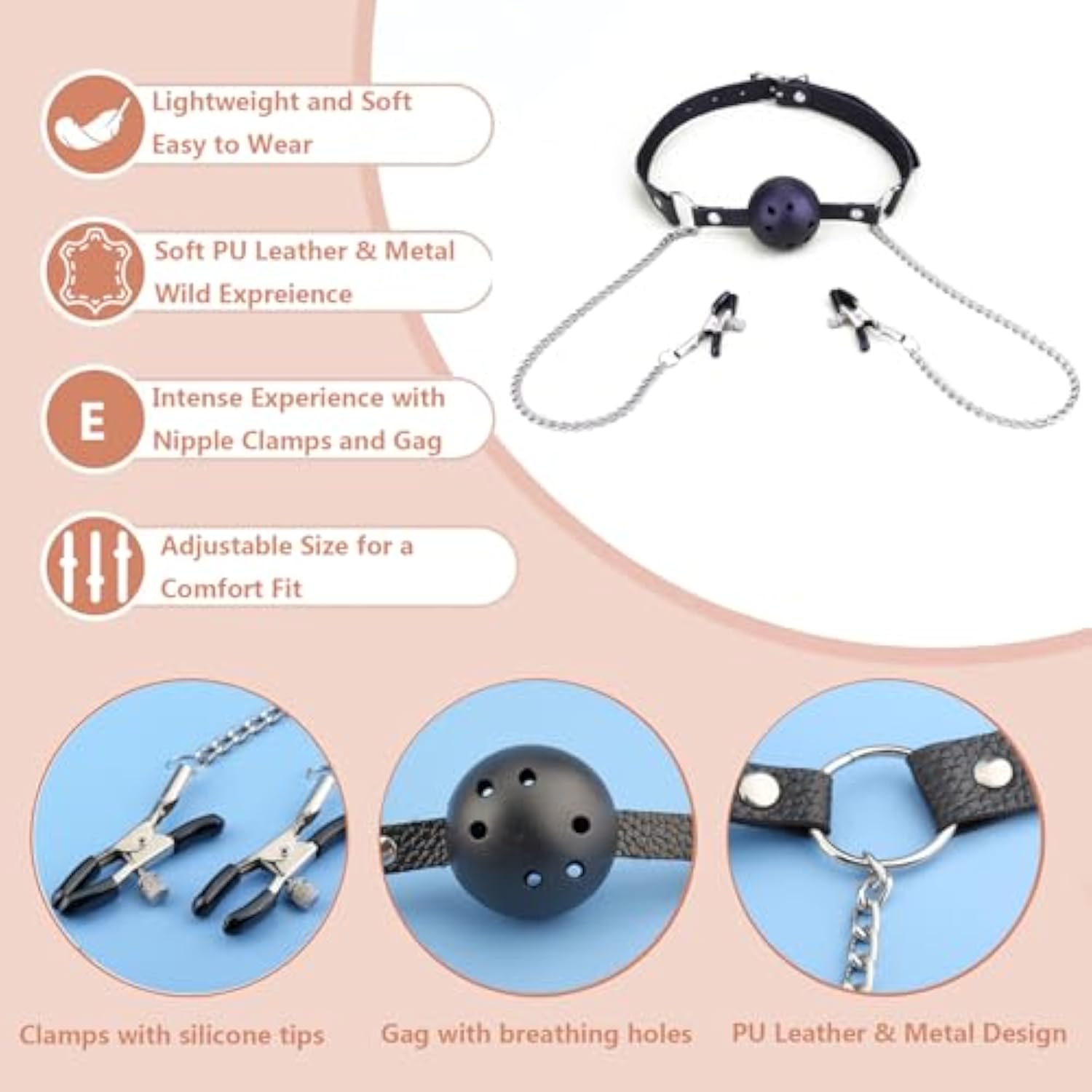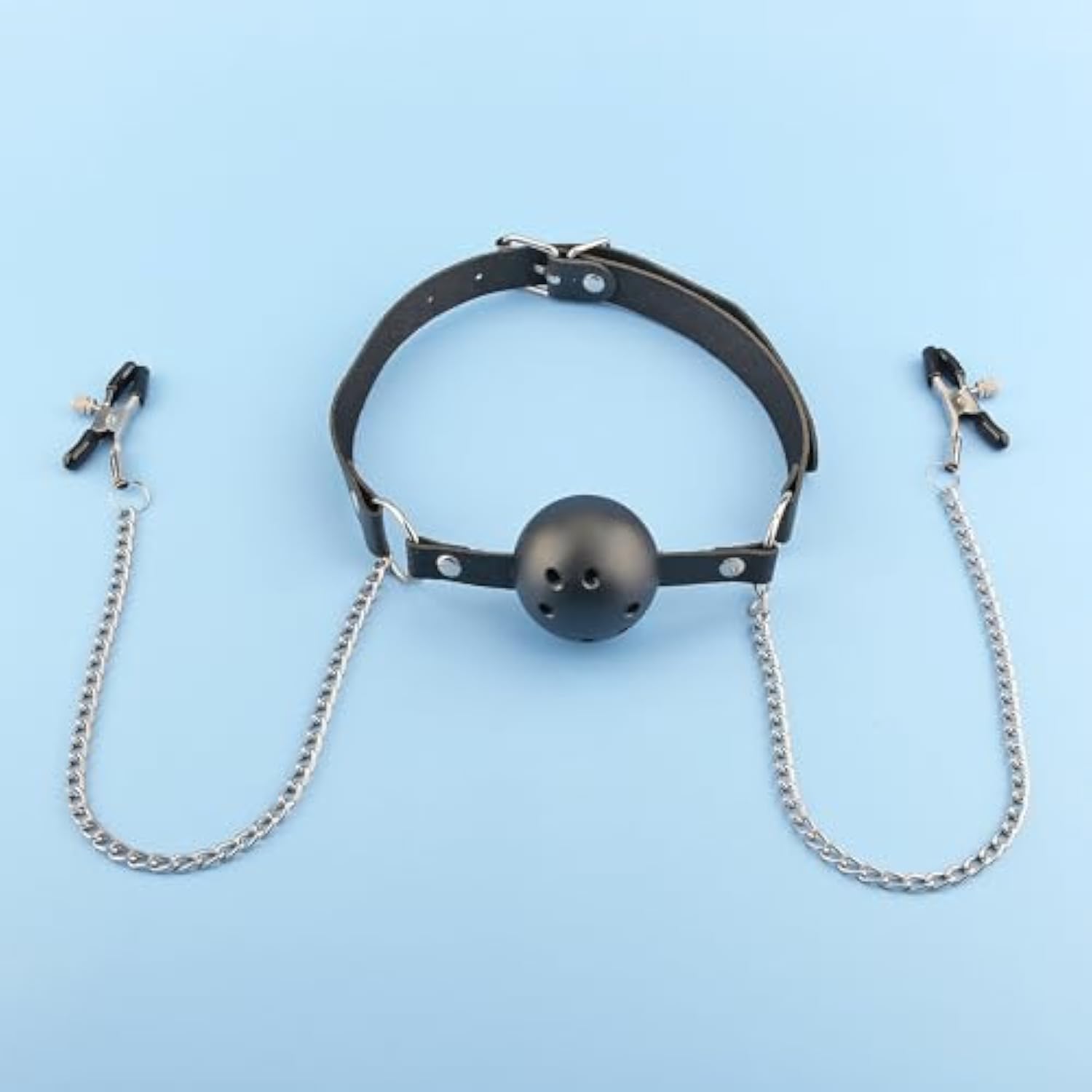 Ball Gag With Nipple Clamps, 4.5Cm Mouth Gag And Breast Clamps With Chains, Slave Restraints Ballgag For Couples Bedroom Play, Sm Bondage Sex Toys Flirt For Women Men Extreme Love (Black)