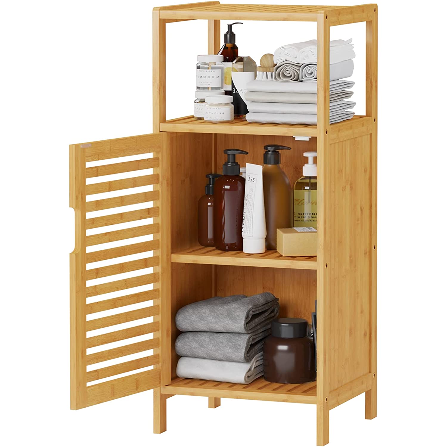 - GREAT ORGANIZER: bamboo storage cabinet is designed with upper open shelves for display and bottom concealed spaces with single shutter door for storage, helps you maximize your vertical space. It is compact and slim and can be put in a small corner or interval, and saves more floor space for other items.