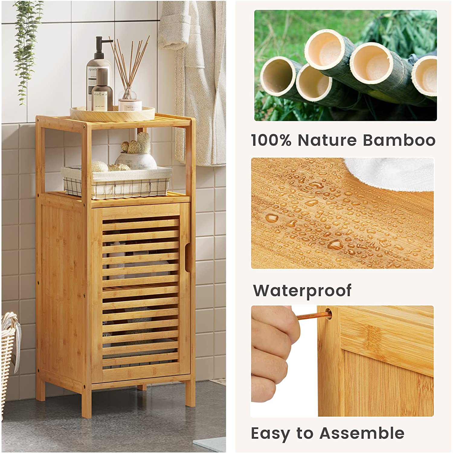 - THOUGHTFUL DETAILS PROCESSING: 3 POLISHING PROCESSES and VARNISH TREATMENTS makes the bamboo bathroom cabinet surface SMOOTH; It is specially designed for humid occasions, perfect storage for bathroom and kitchen; Routine maintenance is also simple, you only need a wet towel to get rid of the dirt or grease.