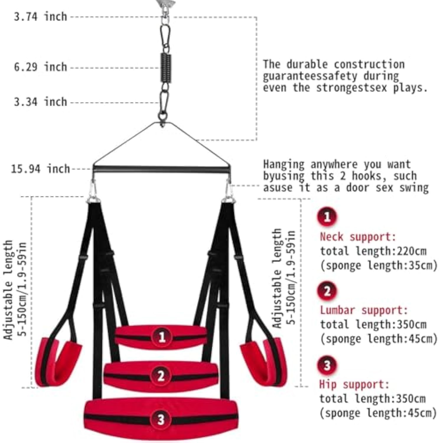 | Sex Swing: The Ceiling Sex Swing Allows Partners To Access Each Other'S Bodies More Easily And Try Out New Positions That Are Not Possible On A Bed Or Couch. | | Safe Material Adult Swings: The Heavy Duty Sex Swing Is Meticulously Crafted From Premium Stainless Steel And The Sex Straps Are Made Of High Quality Nylon Material, Which Can Hold Up To 800 Pounds, Ensuring Safety During Use. | | Soft Padded Adjustable Sex Sling: The Door Sex Swing Has Soft Comfortable Padded And Adjustable Sex Slings, Which Gives Couples Of Any Strength, Height, And Weight The Ability To Try Many Kinds Of Position And Fancy Experiments Comfortably. | | Easy Installation: Our Heavy Duty Sex Swing Has Been Strengthened To Be Compatible With Various Types Of Ceilings And Can Be Easily Set Up Within Just A Few Minutes. Moreover, You Can Transform It Into A Swing Chair For Your Child'S Play During The Day And Into An Adult Sex Swing For Relaxation In The Evening. | | Private Intimate Gift For Couples: This Bdsm Swing Is A Great Sex Toy Gift For Couples To Intimate Your Relationship. And The Adult Swing Will Be Delivered To You In A Private Packaging Pattern. If You Have Any Questions About The Product, Please Feel Free To