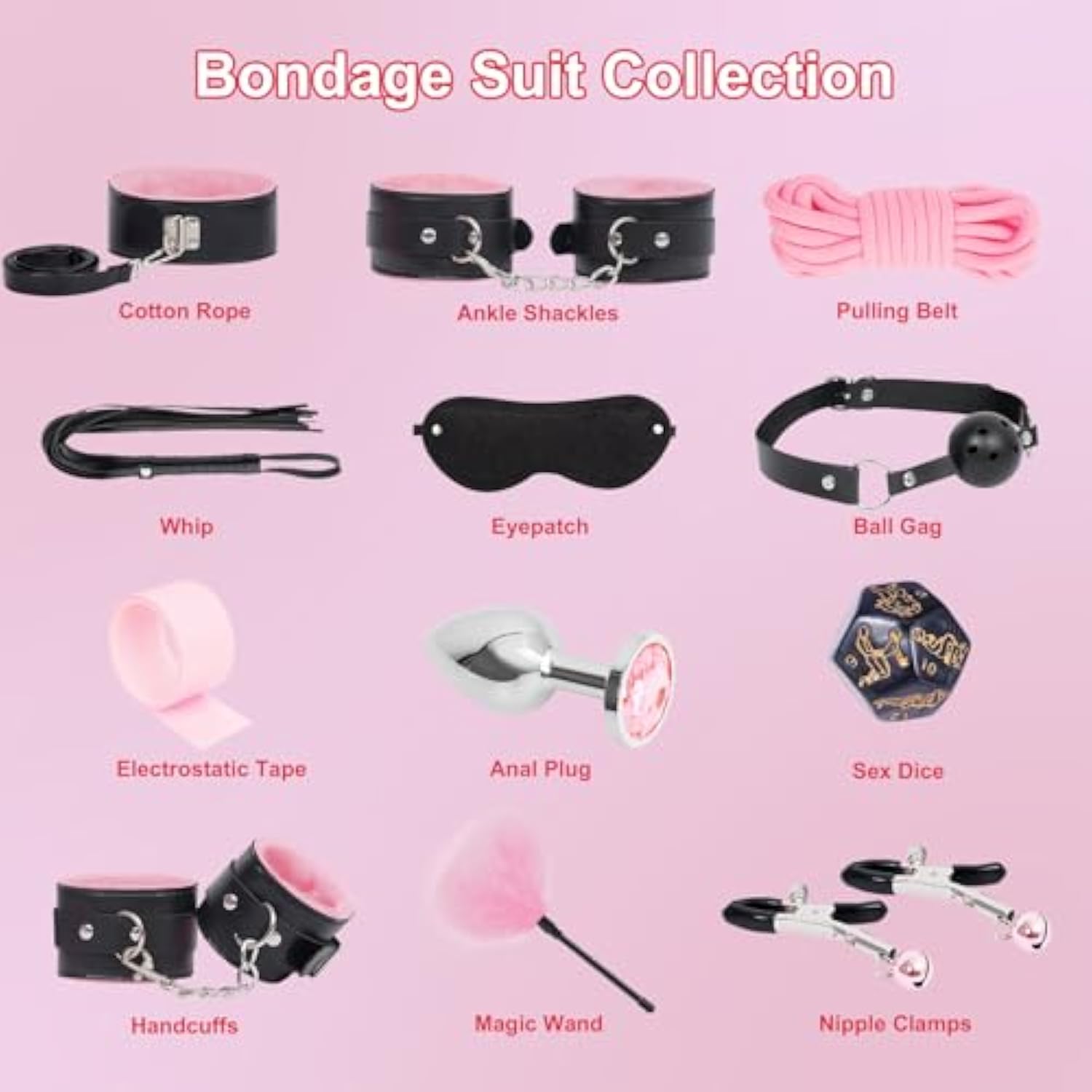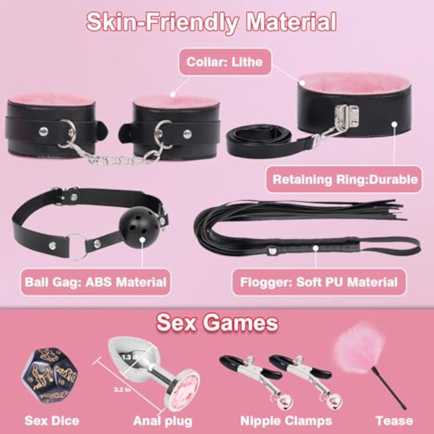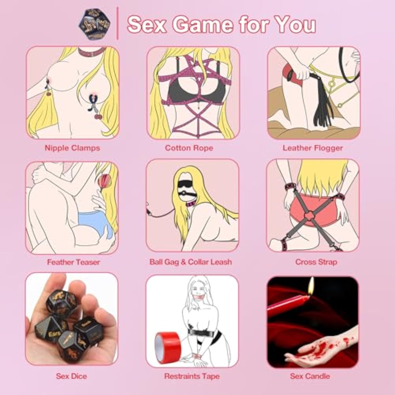| ?Bondage Kits?Our Bdsm Kit Is Ideal For Both Beginners And Experienced Players Looking To Explore Restraint Play. The Bondage Cuffs And Collars Feature A Durable Yet Incredibly Soft Leather Exterior. It’S Plush And Gentle On The Skin, Ensuring Comfort And Safety. You’Ll Find Yourself Fully Immersed In The Experience | | ?Complete Bondage Gear Accessories?This Premium 16-Piece Kit Includes Everything You Need For Adventurous Play: Nipple Clamps, Ball Gag, Restraint Rope, Blindfold, Play Whip, Adjustable Collar, Handcuffs, And Ankle Cuffs,3Pcs Low Temperature Candles, Bondage Tape, Anal Plug, Sex Dice, Feather Stick, Cross Strap. Perfect For Couples Looking To Spice Up Their Relationship With Trust, Creativity, And Passion. | | ?Adult Plugs Butt Meticulous Designe?Our Anal Toy Are New Smooth, Solid Stainless Steel Design, Conical Shaped Jewelry Decoration, This Sex Toys Easy To Clean And Storage, Just Rinse With Mild Water And Wipe Dry | | ?Romantic?Our Low Temperature Candles Are Perfect For Setting A Romantic Mood. Use Them To Create A Magical Atmosphere That Inspires Feelings Of Compassion And Pleasure In Your Loved One. | | ?Discreet Packages And After Sales?Dedicated Sealed Box To Protect Your Privacy. | |