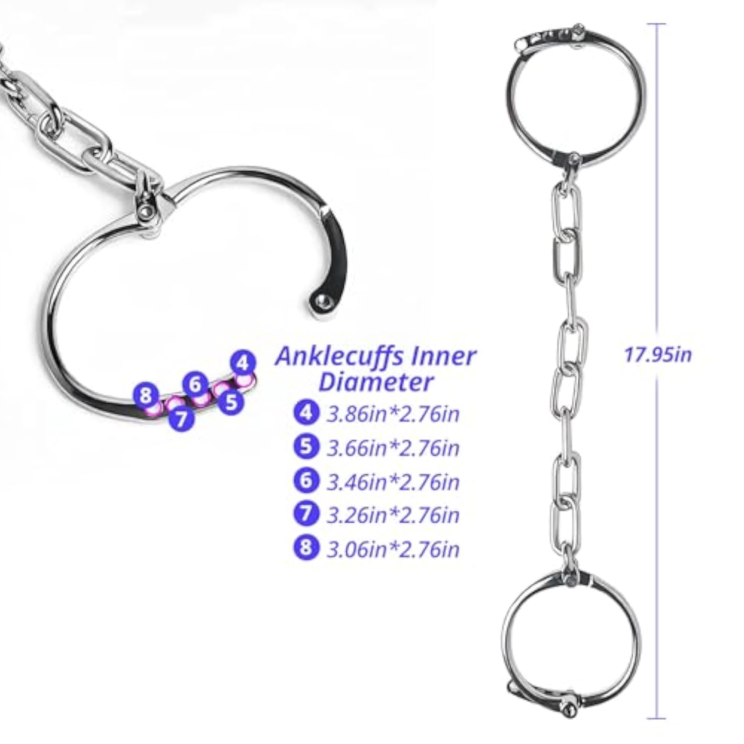 | No Key Design: Meatl Ankle Cuff Design With No Key,No Need To Worry About Key. You And Your Lover Can Feel Free To Enjoy Sm Feeling From This Handcuff To Spice Up Your Sex Life. | | Premium Quality Material:This Couples Bondage Sex Toy Is Made Of High Quality Stainless Steel With Smooth Surface, No Burrs And Sharp Edges, So You Can Focus On Your Sex Play With Confidence! | | Adjustable Size: This Bdsm Ankle Cuff Has 5 Adjustable Sizes To Change The Size Of The Ankle Cuff Depending On The Gears You Snap Into It. The Minimum Inside Diameter Of The Ankle Cuffs Is 3.06 Inches, Then 3.26 Inches, 3.46 Inches, 3.66 Inches, And Adjustable Up To 2.86 Inches. As A Result, These Metal Ankle Cuffs Are Suitable For Men And Women Of Most Sizes. | | Control Your Partner:You Can Engage In Romantic Sexual Activities With Your Partner On The Bed Or On The Carpet, Using The Ankle Cuffs Of This Sex Toy For Women To Securely Fasten Your Wrists Or Ankles. Of Course, You Can Also Separate Your Hands And Ankles For Bondage Play. Use Your Imagination And Make Her Your Slave In That Moment! | | Discrete Packaging: The Metal Ankle Cuff Come In Discreet Standard Packing,Keep Your Privacy In Strictest Confidential, No One Know What You Get. | |