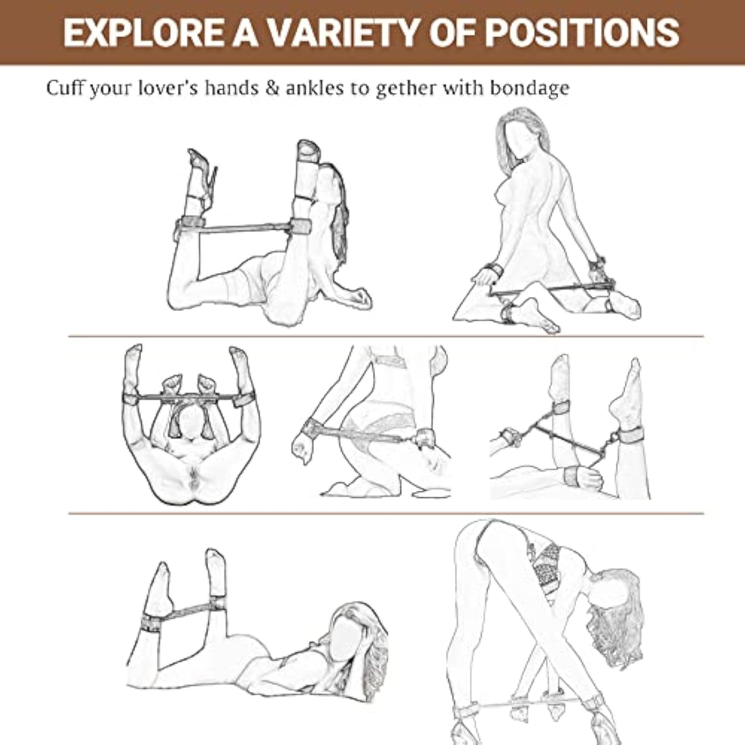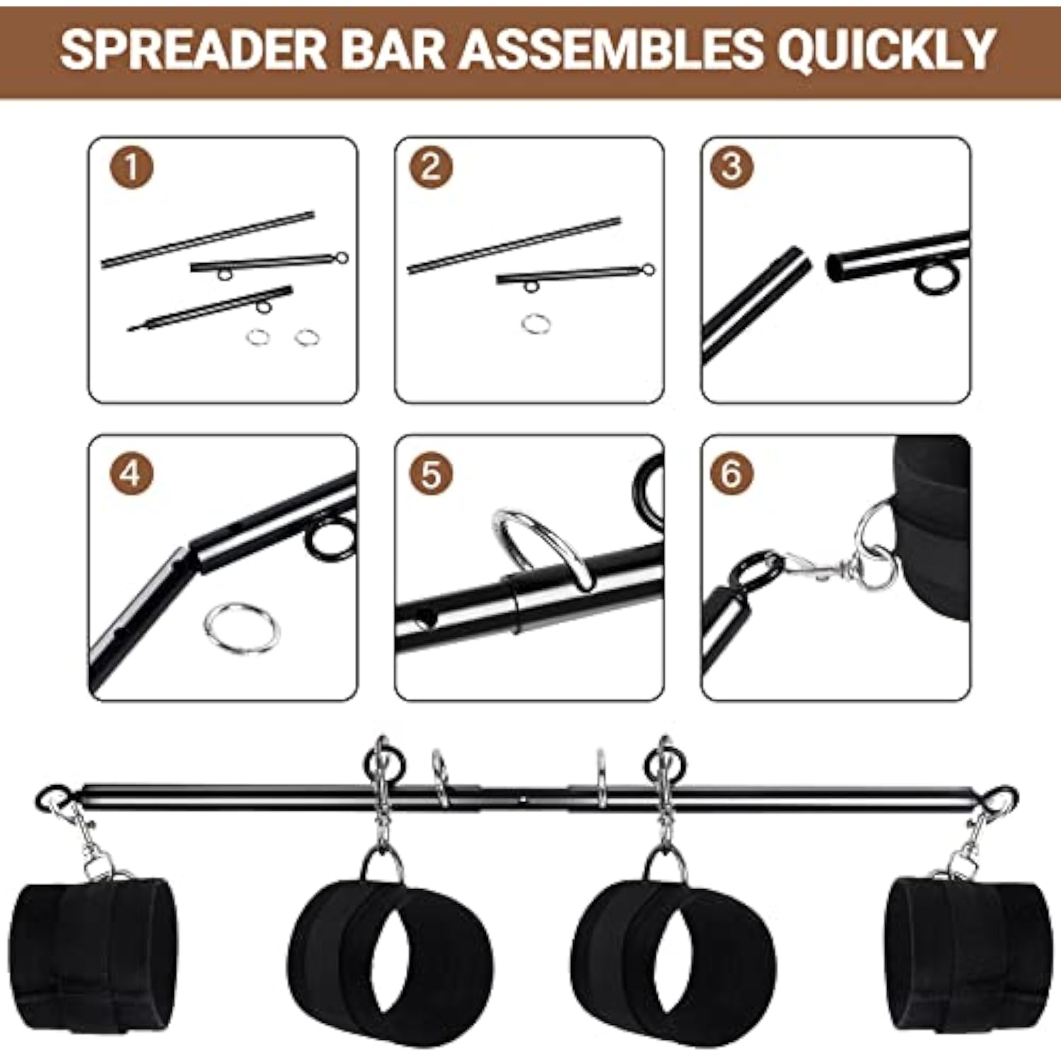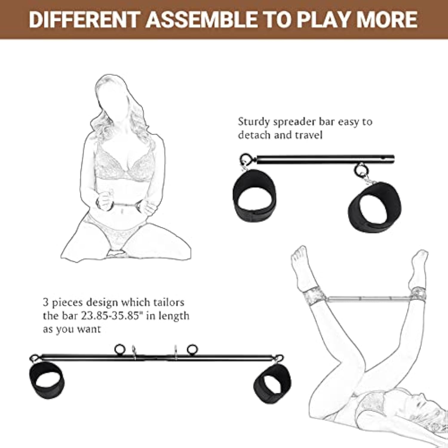 - ?Bondage Fun With Spreader Bar Together! Use The Spreader Bar In Different Ways To Discover Tease Play With The Bondage Kit. Restrain And Fasten Her Ankles And Wrists, For Spreading Whilst Standing, Laying On The Back, Prone, Or With Legs Up For Deeper