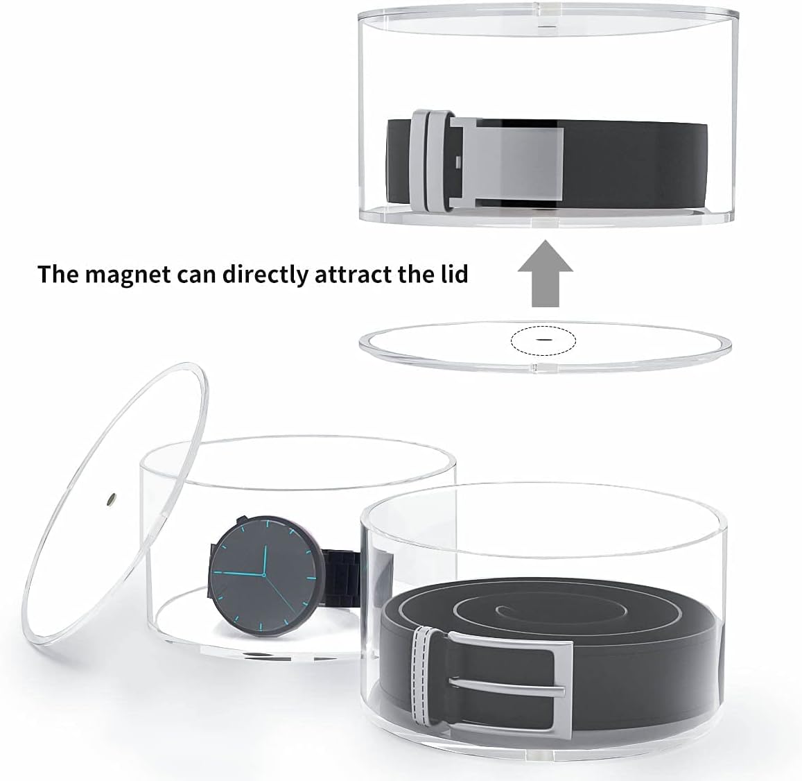 - SEPARATE BELT HOLDER - This is a 5-layer belt storage rack. Each box has a lid. There is a magnet on the box. When you remove the upper layer, the lower lid will be attracted by the magnet, so you don't need to remove the lid again. WARM TIP: please check the size of the belt buckle.The belt buckle only fits 2.5 inches in height.