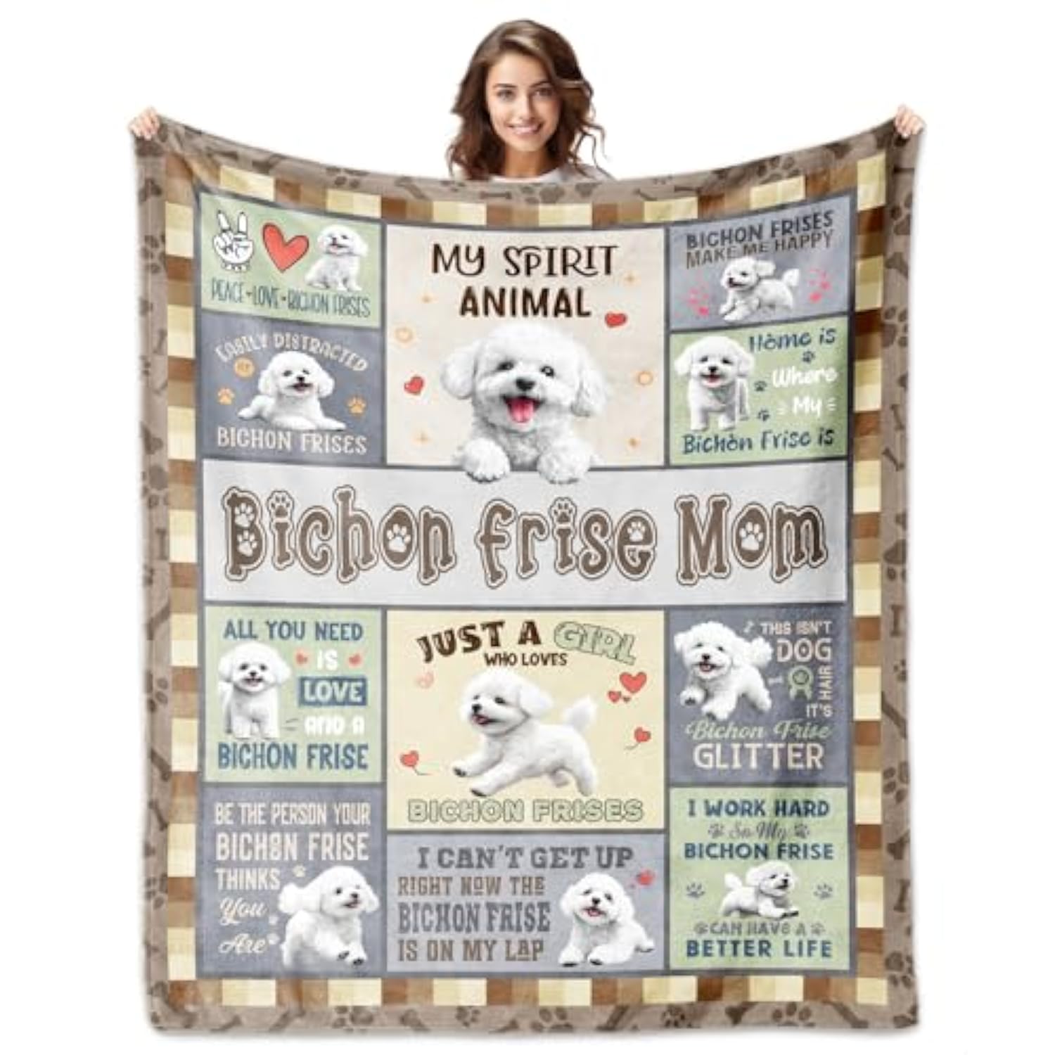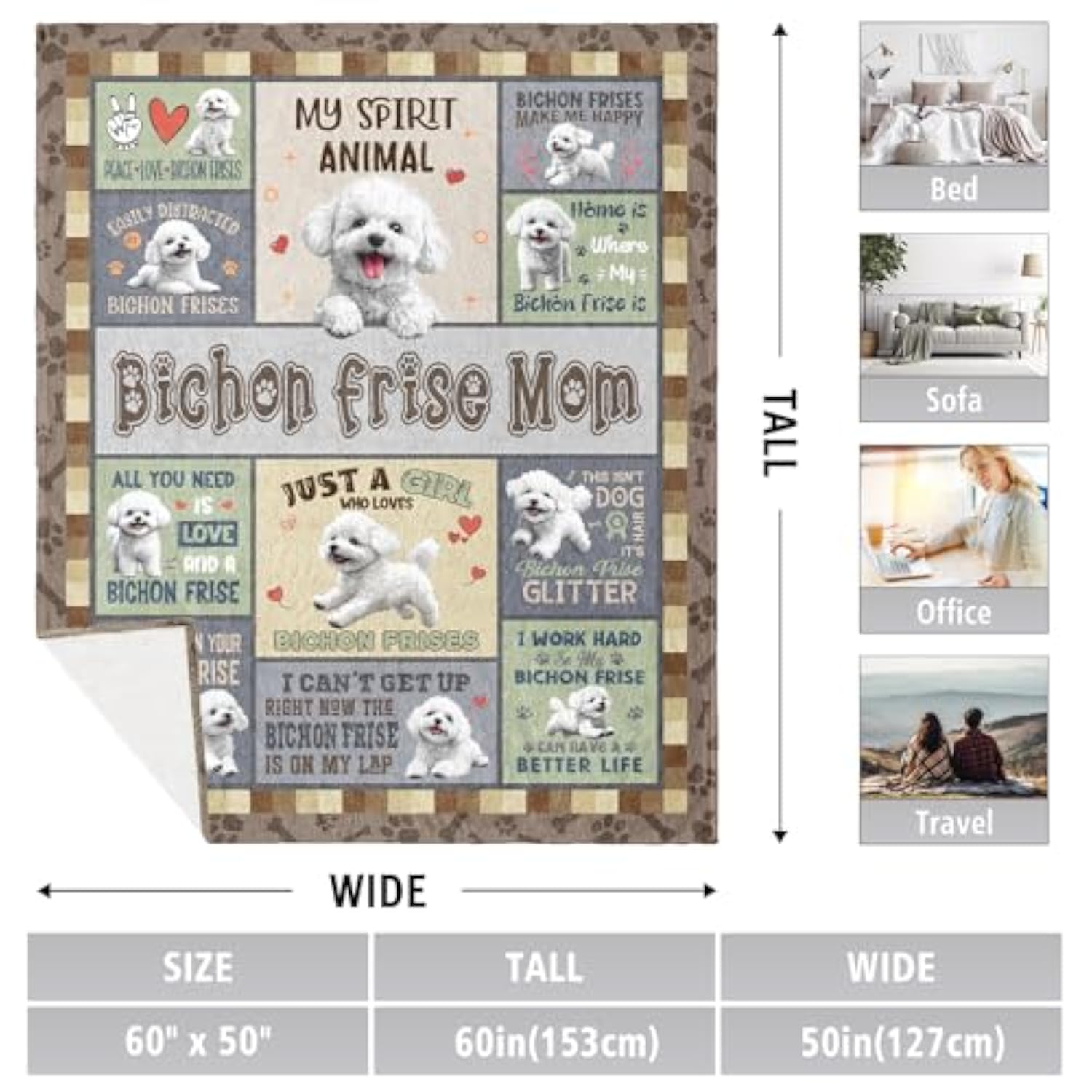 | ?Material Size?: This Bichon Frise Gifts Blanket Size Is 60X50 Inches. It'S Made Of Good Quality Flannel Material, Lightweight, And Can Be Folded Compactly. It Is A Gift You Will Love To Give. The Blanket Pattern Is Bright And Clear, Very Soft To Snuggle Up Comfortably | | ?Bichon Frise Gifts Blanket?: Whether You Search For A Bichon Frise Enthusiast, A Proud Dog Mom, Or A Loved One Who Adores Furry Companions, This Blanket Is A Heartfelt Choice For Every Occasion. It’S Not Just A Blanket, It’S A Warm Tribute To Their Love For Bichon Frises, Making It Ideal As Bichon Frise Gifts For Dog Mom | | ?Applicable Scene?: More Than Just A Gift, This Blanket Doubles As Decorations For Mothers Day, Christmas, Birthday, And Other Special Moments. Its Cute Bichon Frise Design Adds A Touch Of Warmth And Personality To Any Living Space, Whether Draped Over A Sofa, Laid Across A Bed, Or Used As A Decorative Throw. It’S A Functional Decor Piece That Brings Joy Year-Round | | ?Gifts For Dog Lovers?: Crafted For Anyone Who Adores Bichon Frises, This Blanket Features Charming Bichon Frise-Themed Details That Resonate With Owners And Lovers Alike. It’S A Unique Way To Celebrate Their Passion For The Breed | | ?Easy Care?: Our Bichon Frise Throw Blanket Is Super Easy To Care For. Use Room Temperature Water Machine Washable Or Hand Washable, Tumble Dry Low Temperature. Do Not Use Bleach Or Iron. This Way The Prints On The Blanket Show Beautiful Vibrant Colors Even After Washing | |