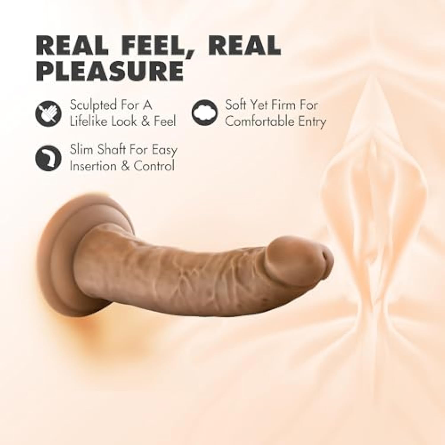 Blush Dr. Skin 7.5” Realistic Slim Shaft Dildo, 1.5” Wide Soft Lifelike Cock - Suction Cup, Strap-On Solo Or Partner, Body-Safe Anal & Pegging Play - Adult Sex Toy For Women, Men & Couples - (Mocha)